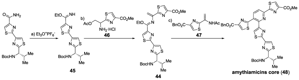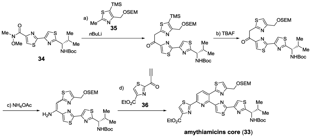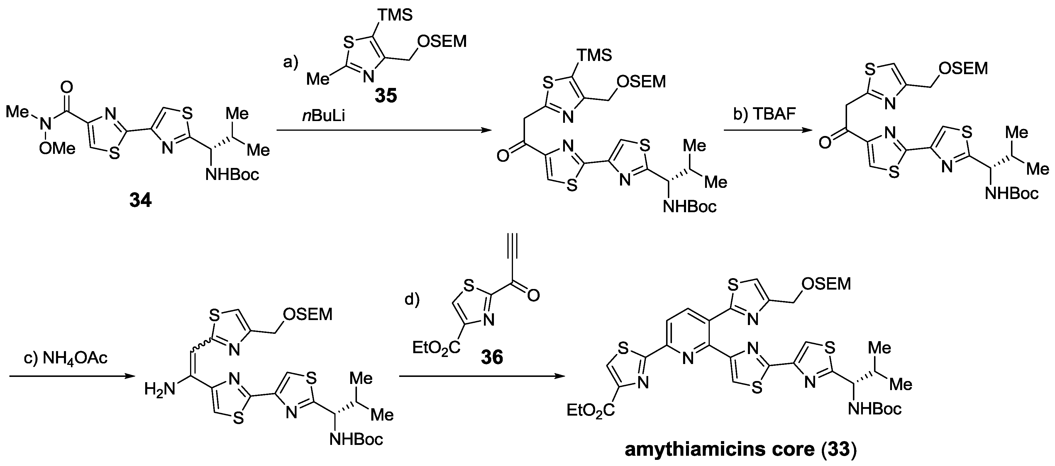 Bagley, first in Moody’s group, and co-workers also described their own syntheses of the thiopeptide cores, such as the amythiamicins core (33), constructing the pyridine ring with advanced thiazole-containing building blocks 34−36. Using Bohlmann-Rahtz pyridine synthesis, various thiopeptide cores were obtained [134,154,155,156,157,158,159] (Scheme 11). In addition, a very early total synthesis of promothiocin A was achieved [125,160,161].