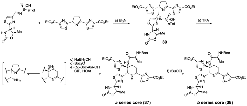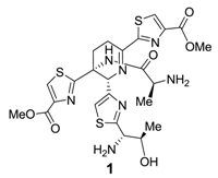 The assignment of thiopeptide structures can be a very complex task, as exemplified by thiostrepton, of which structure elucidation was originally addressed by degradation studies and structure determination of fragments [23]. However, the later use of X-ray diffraction was essential to elucidate both connectivity and stereochemistry [24,25]. Although the development of NMR spectroscopy techniques has permitted the elucidation of many structures of thiopeptides, a high degree of uncertainty remains until further evidence is provided. This was clearly the case of micrococcin P1 [26]. Early studies on its constitution by hydrolysis [27,28,29] of the natural extract permitted the identification of most moieties present in micrococcin; however, there was no clear evidence of its connectivity. Later on, NMR studies [30,31,32] and synthesis of proposed structures [33,34,35,36] of the natural compound resulted in better hypotheses for its constitution and stereochemistry, although none of the synthesized products was identical to the natural one. It was not until its total synthesis was achieved by Ciufolini in 2009, 51 years after its discovery, that micrococcin P1 structure and stereochemistry were finally confirmed [37].