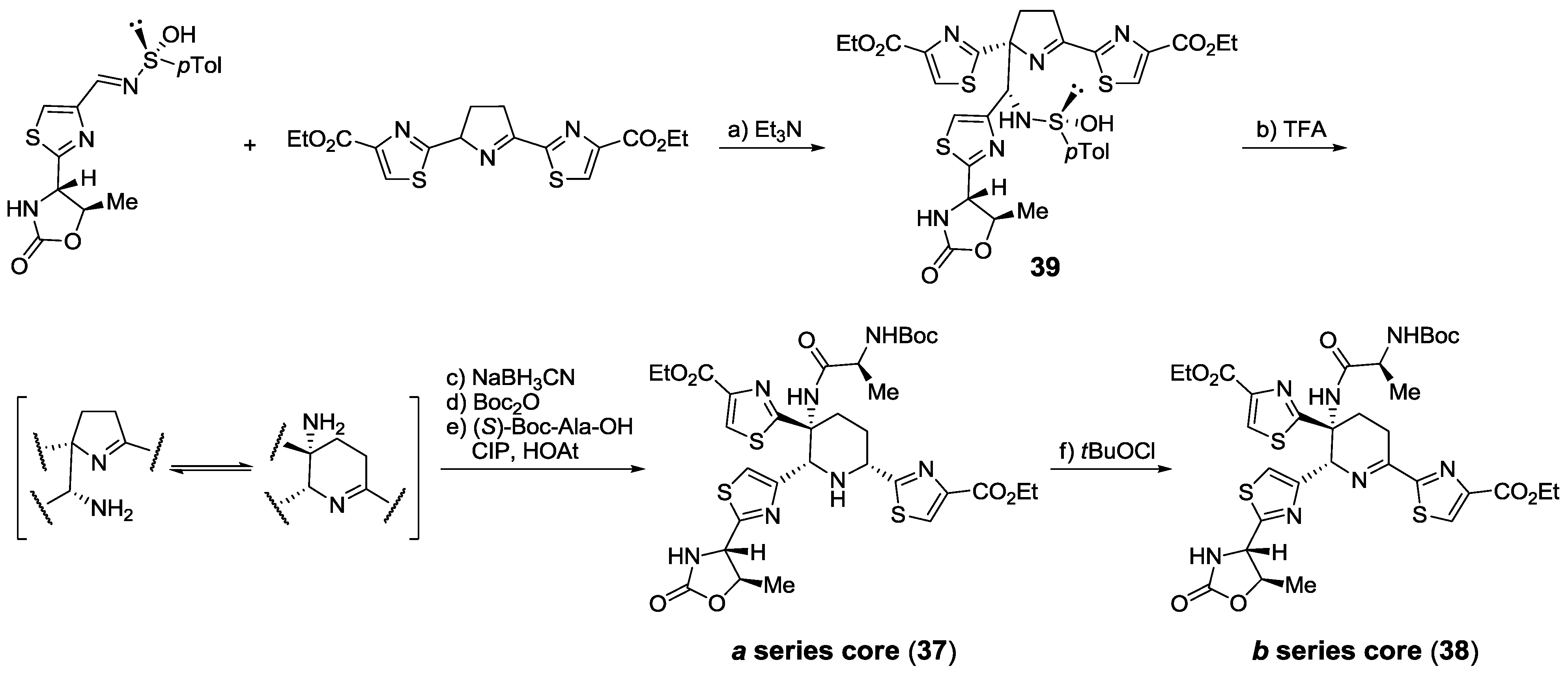 - Nicolaou, K.C.; Nevalainen, M.; Safina, B.S.; Zak, M.; Bulat, S. A biomimetically inspired synthesis of the dehydropiperidine domain of thiostrepton. Angew. Chem. Int. Ed. 2002, 41, 1941–1945. [Google Scholar] [CrossRef]