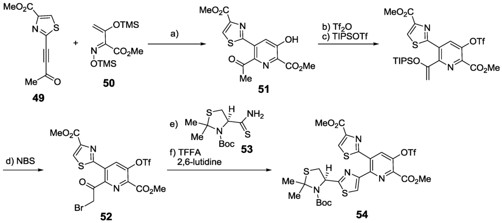As exemplified by micrococcin P1, a synthetic approach to the problem can serve as the ultimate confirmation for both connectivity and stereochemistry. This strategy also includes the comparison of fragments with their synthetic counterparts; such was the case of GE2270A [48]. Synthesis of thiopeptides polyheterocyclic cores has been used to confirm the structure of the corresponding degradation products, while, at the same time, it has also permitted the development of the necessary synthetic methodology [49].