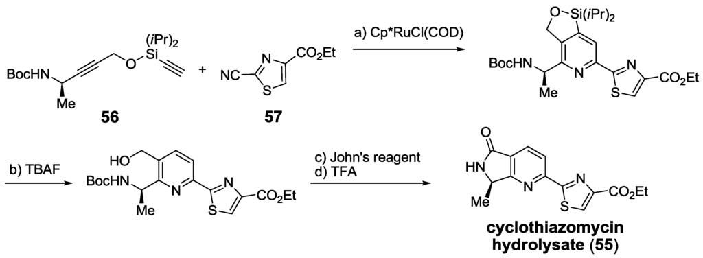 - Zou, Y.; Liu, Q.; Deiters, A. Synthesis of the pyridine core of cyclothiazomycin. Org. Lett. 2011, 13, 4352–4355. [Google Scholar] [CrossRef]