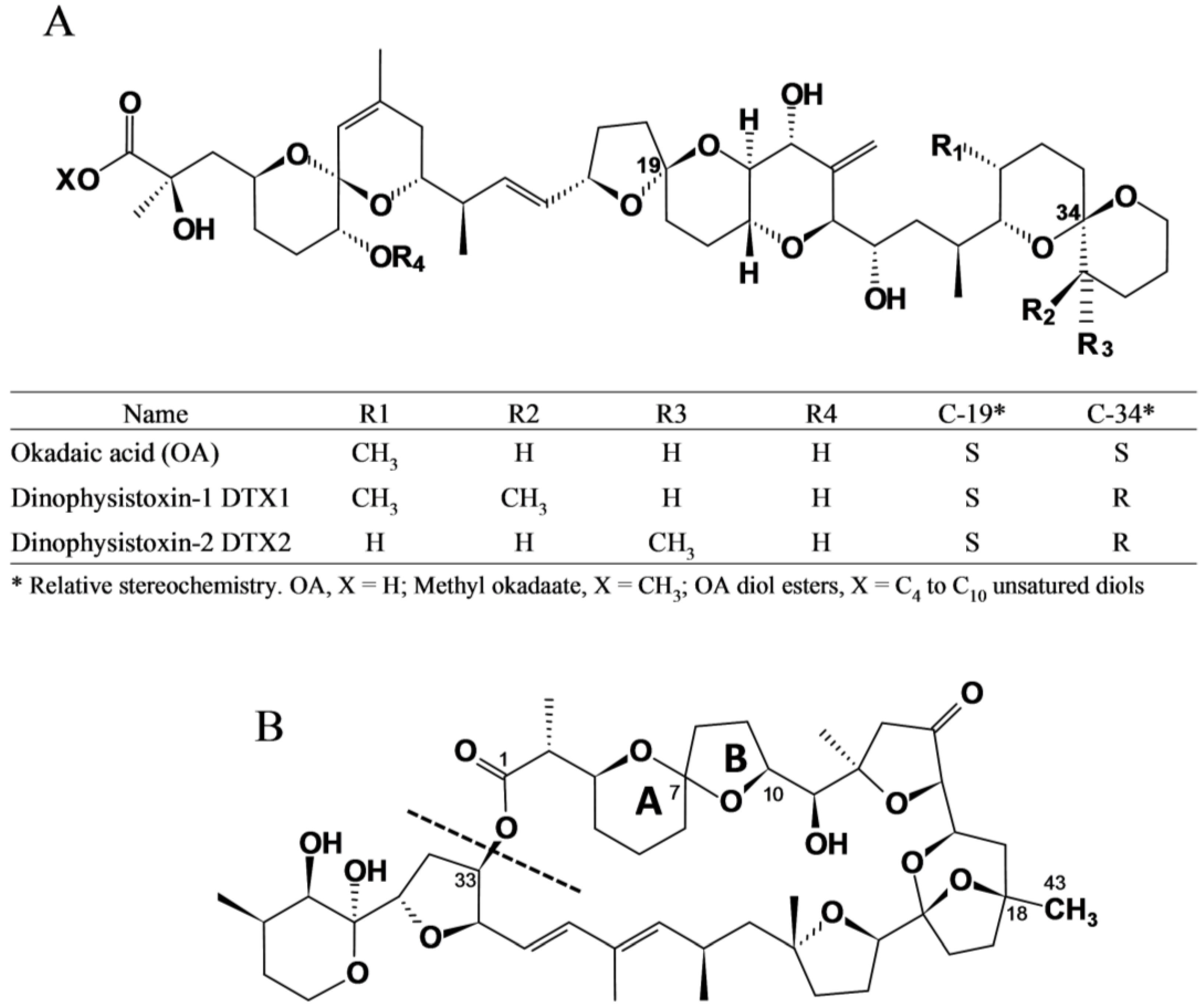 Chemical structure of (A) okadaic acid and its congeners (OAs) and (B) pectenotoxins (PTXs). A dashed line in the link O–C33 indicates where hydrolysis to produce pectenotoxin seco-acids (PTX-SA) takes place.