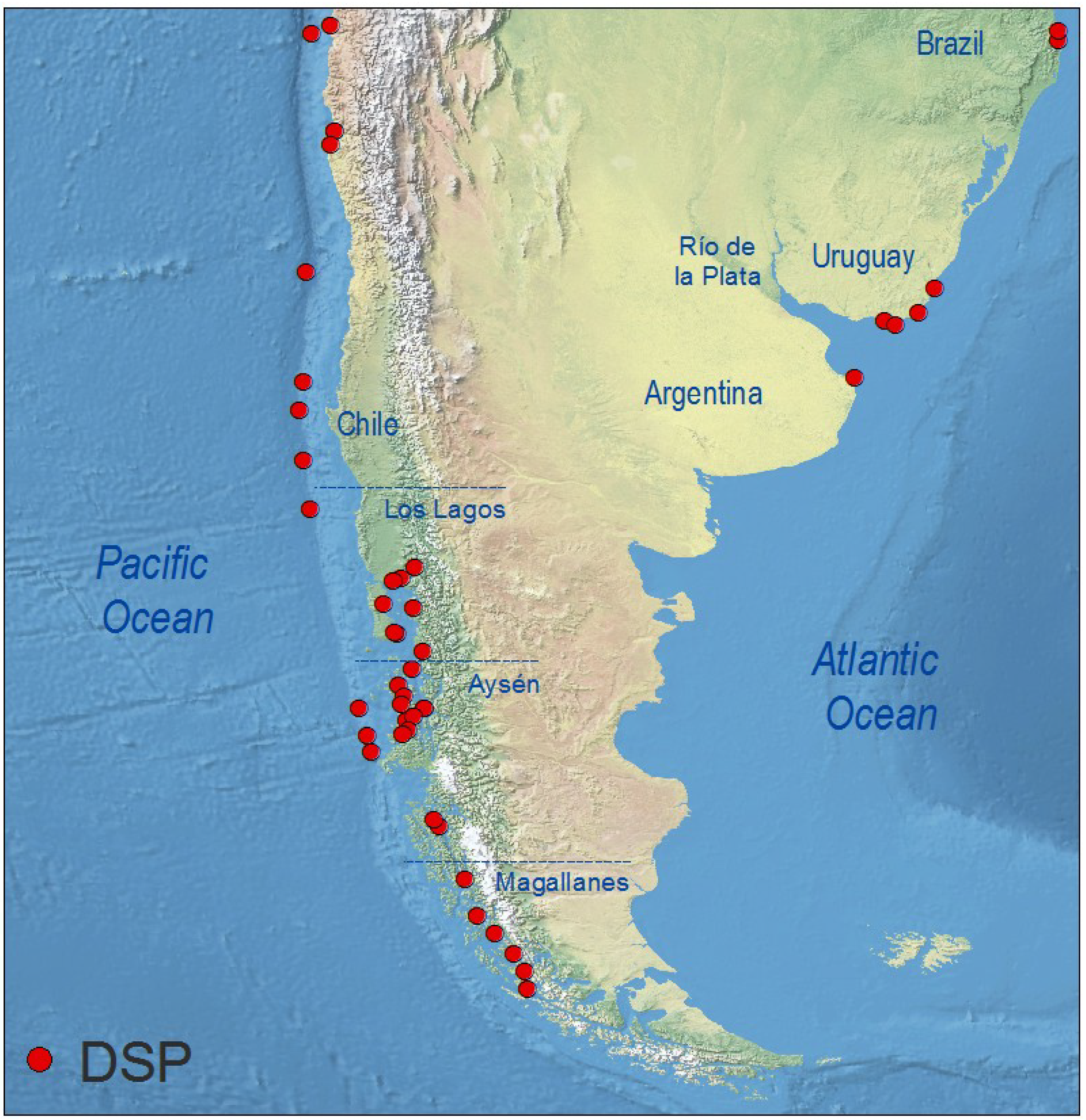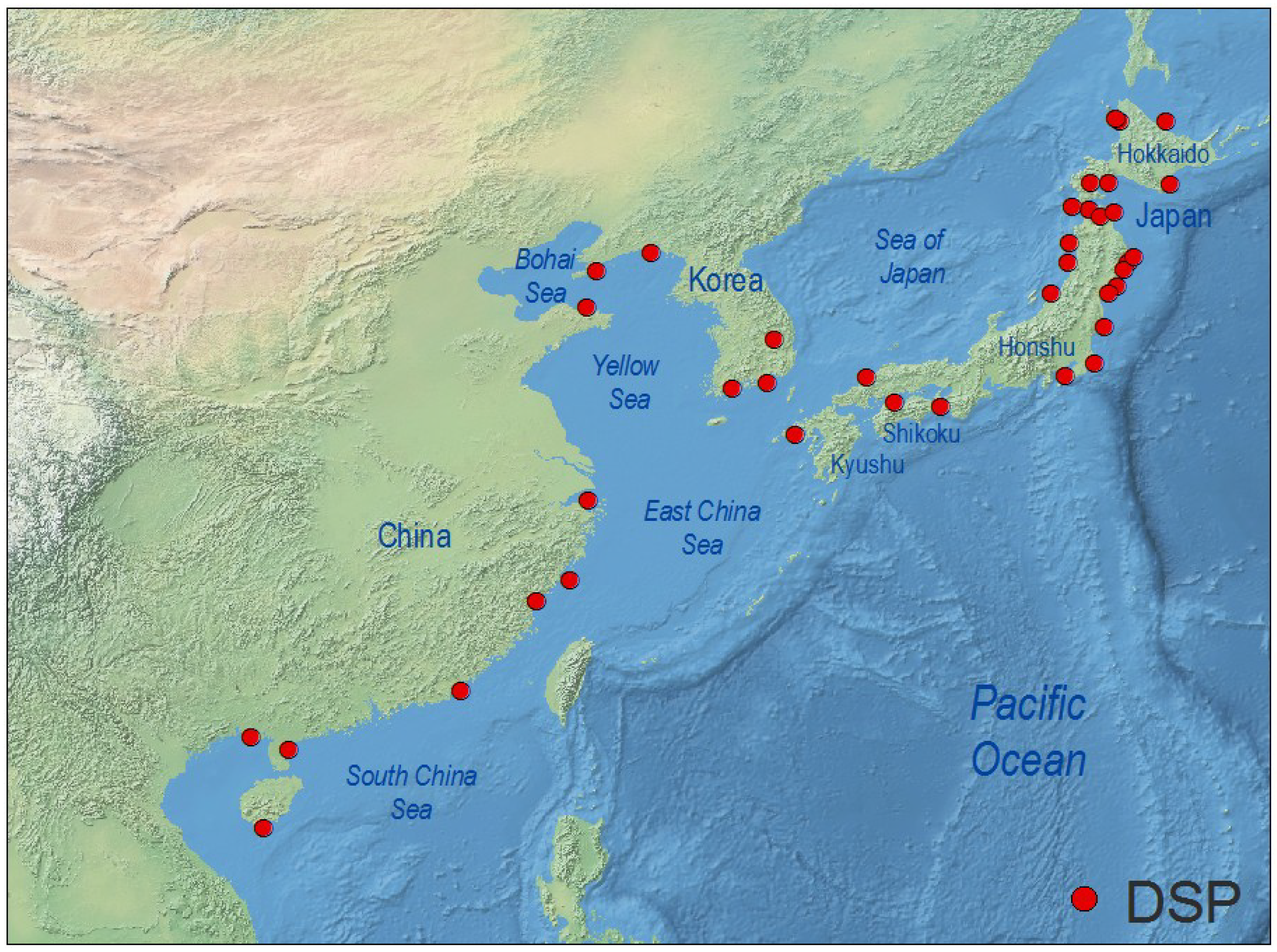 Symptoms of DSP are very unspecific and affected consumers may not report them except during exceptional outbreaks requiring hospitalization. As “Max” Taylor phrased it 10 years ago: “No DSP has been diagnosed in humans in British Columbia, but, given its resemblance to diarrhoea caused by bacterial contamination (Vibrio haemolyticus in particular), would DSP be detected without testing specifically for okadaic acid or dinophysistoxin?” [26]. DsT levels that do not cause gastrointestinal illness but are around or even well above the regulatory limits are overlooked if monitoring of these toxins has not been established in nearby shellfish production areas. For these reasons, any present world distribution map of DSP toxins and related outbreaks will underestimate the magnitude of the problem (Figure 3). It will just represent either hot spots, where an intense gastrointestinal event led to an investigation of the causative agents, or areas with important shellfish exploitations, where regulations for DSP toxins have been enforced. The map will change substantially in the near future as new shellfish producing regions start exporting their products to countries requiring safe limits of regulated toxins as a must for seafood imports. Meanwhile, consumers will continue acting as a “human bioassay” to provide evidence that the risk of DSP in many areas where these toxins are not monitored is far from negligible.