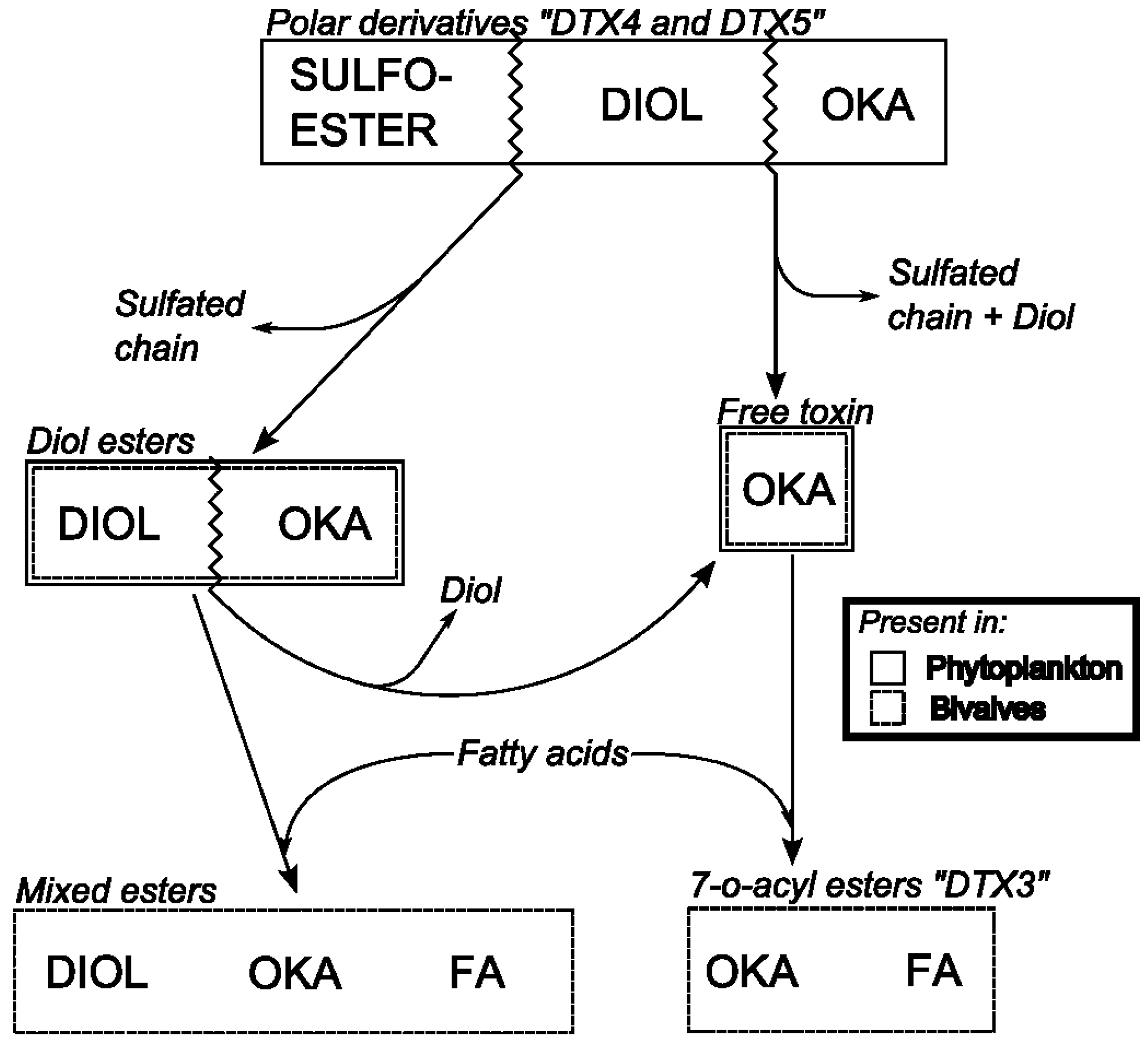 Three groups of polyether toxins—OAs, yessotoxins (YTXs) and PTXs—with different molecular structures were initially included in the “Diarrhetic Shellfish Poisoning” (DSP) toxin complex as they often co-occur in natural microplankton assemblages and in filter-feeding molluscan shellfish species exposed to them. In addition, they are co-extracted in the lipophilic fraction from plankton and shellfish samples and detected together (estimated as OA equivalents) by mouse bioassay (MBA) [2,11,12]. It is now well established that the three groups of toxins have different biological effects and that only OA and its congeners are diarrhoegenic [13,14,15].
