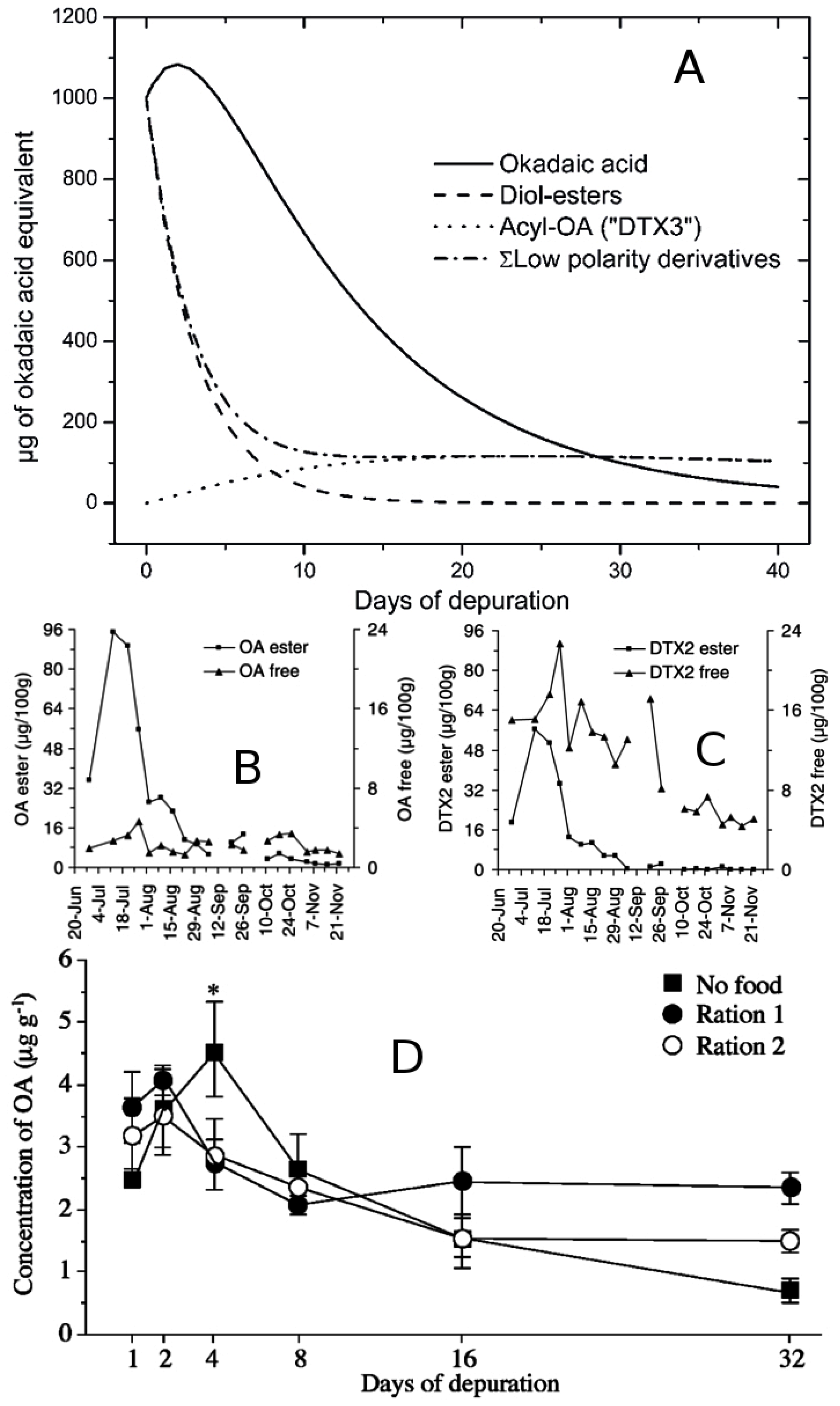 Dinophysis strains with OAs toxin content two to three orders of magnitude higher than strains from “DSP-free” areas, such as the Northeast US [36], are the main culprits in the region. In addition, suspended mussel cultures (long lines and rafts) enhance the natural high toxin uptake of mytilids compared with other shellfish species exploited on natural banks. Blooms of species of the D. acuminata complex (D. acuminata, D. ovum, D. sacculus) start in spring, followed by those of D. acuta in late summer in regions where appropriate thermal stratification develops in shelf waters. Outbreaks are less frequent in higher turbulence regions such as the Southern Bight of the North Sea and the English Channel [188]. The worst scenario is represented by long lasting blooms of D. acuta, following previous blooms of D. acuminata complex species, leading to high accumulation of toxins in late autumn. Low depuration rates in winter cause harvesting bans to persist throughout the winter after toxic species are no longer present in the water column. This occurred after the autumn of 2005 bloom of D. acuta in the Galician Rías, site of an annual production of 25 × 104 t of Mediterraneam mussel, causing accumulation of DsT above the RL until March, 2006 [189]. Despite monitoring efforts, human intoxications still occur, caused mainly by uncontrolled recreational harvesting in years of intense episodes. Such was the case in Northern Portugal after ingestion of wild mussels in a record year when levels of DsT in shellfish up to 112 × RL were detected [190]. During exceptional outbreaks, shellfish may not be the only vectors. In the summer of 2002 over 200 people reported intoxications after eating brown crabs (Cancer pagurus) in Southern Norway. Toxicity 25 × RL had already been found in mussels nearby. Most DsT in the crabs were in the form of fatty acid esters of OA [191]. Intoxications after eating green crabs (Carcinus maenas) had previously occurred in Northern Portugal [192].