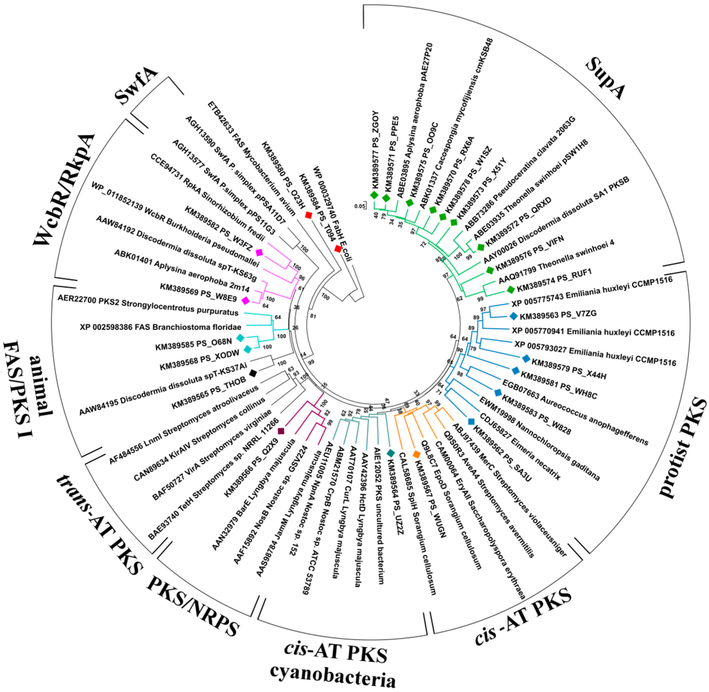Neighbor-joining tree of KS domains from cis-AT PKS, trans-AT PKS, cyanobacterial cis-AT PKS, Sup, animal FAS/PKS I, protist PKS, PKS/NRPS, RkpA/WcbR, and Swf enzymes. Partial KS sequences amplified from the metagenome of P. halichondrioides are included in the tree and labeled with diamonds (♦). The KS tree is rooted with the E. coli FabH as outgroup. Bootstrap values are given at the nodes.