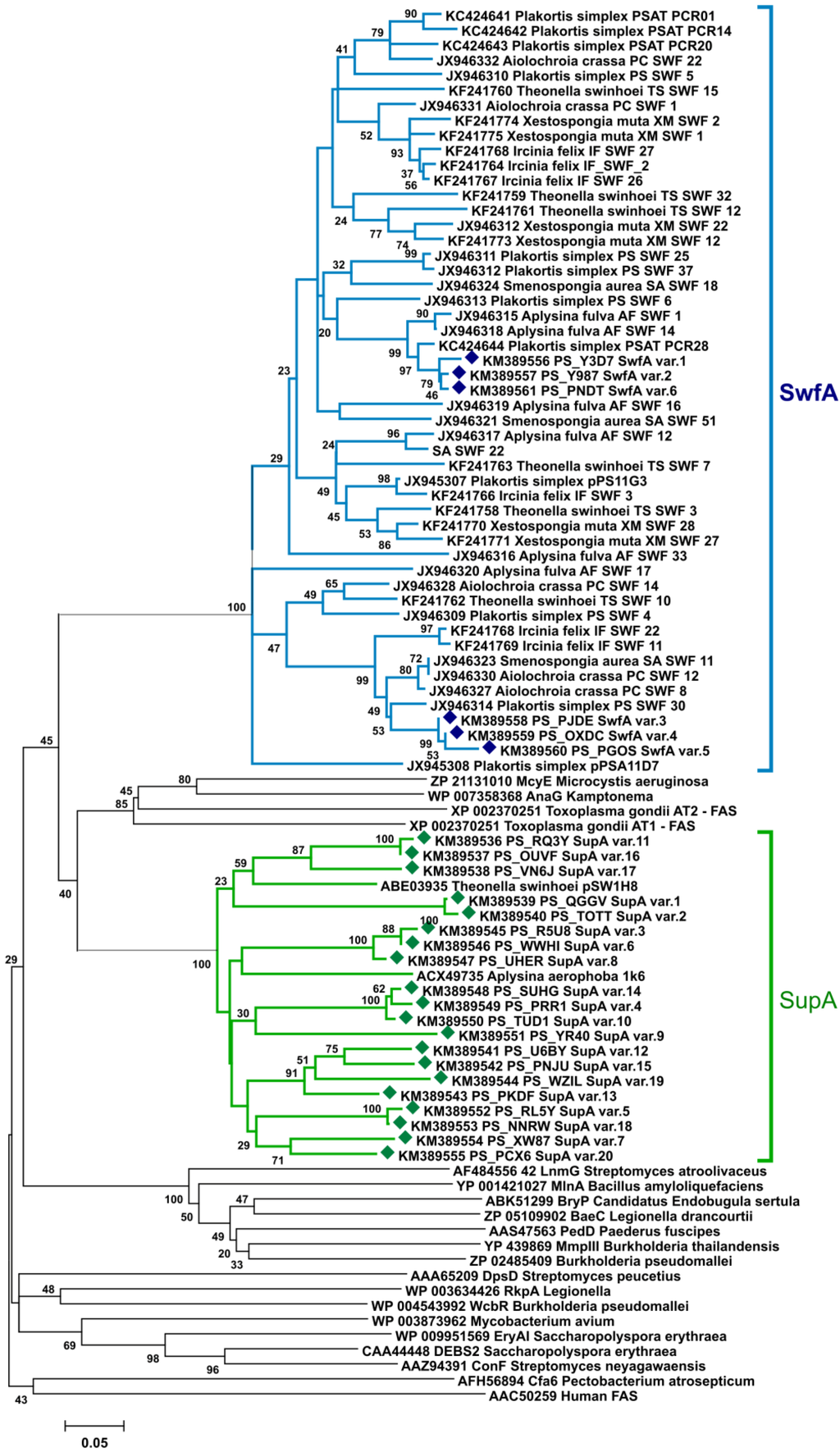 Neighbor-joining tree (p-distance model) of AT modules from SupA, SwfA, cis-AT PKS, trans-AT PKS, WcbR/RkpA, and FAS enzymes. Sup and Swf AT fragments amplified from the metagenome of P. halichondrioides are included in the tree and labeled with diamonds (♦). Bootstrap values are given at the nodes (values <20% are hidden).