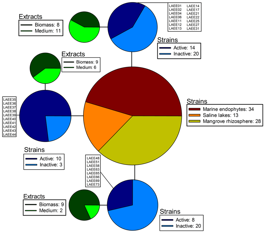 Distribution of the strains isolated in this study in function of their origin (central circle); proportion of active and inactive strains in each case (blue circles); and origin (biomass or culture medium) of the active extracts in each case (green circles).