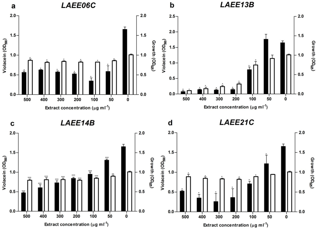 Growth inhibition (white bars) and violacein inhibition (black bars) caused by different concentration of the fungal extracts: (a) LAEE06C; (b) LAEE13B; (c) LAEE14B and (d) LAEE21C. Data represent the mean ± SD. Asterisks indicate significant differences respect the untreated control (one-way ANOVA, Dunnett’s multiple comparison test, p < 0.05).