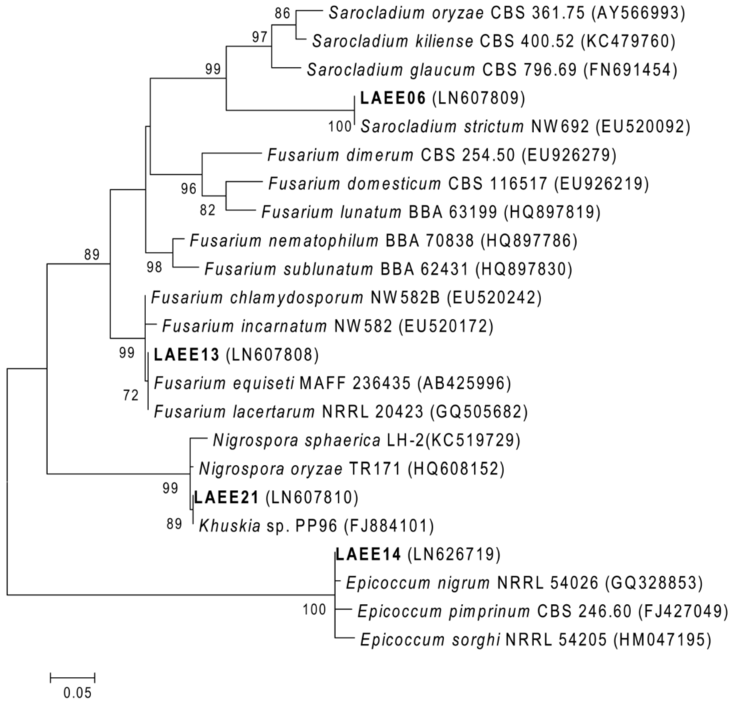 ML and NJ tree reconstructions were used in the phylogenetic analysis, however, as both showed the same topology, only the ML tree is included in the text (Figure 3, Supplementary Figure S1). The four isolates were placed, with high statistical support (99% and 100% bootstrap values), on four different branches corresponding to the genera Sarocladium (LAEE06), Fusarium (LAEE13), Epicoccum (LAEE14), and Khuskia (LAEE21).