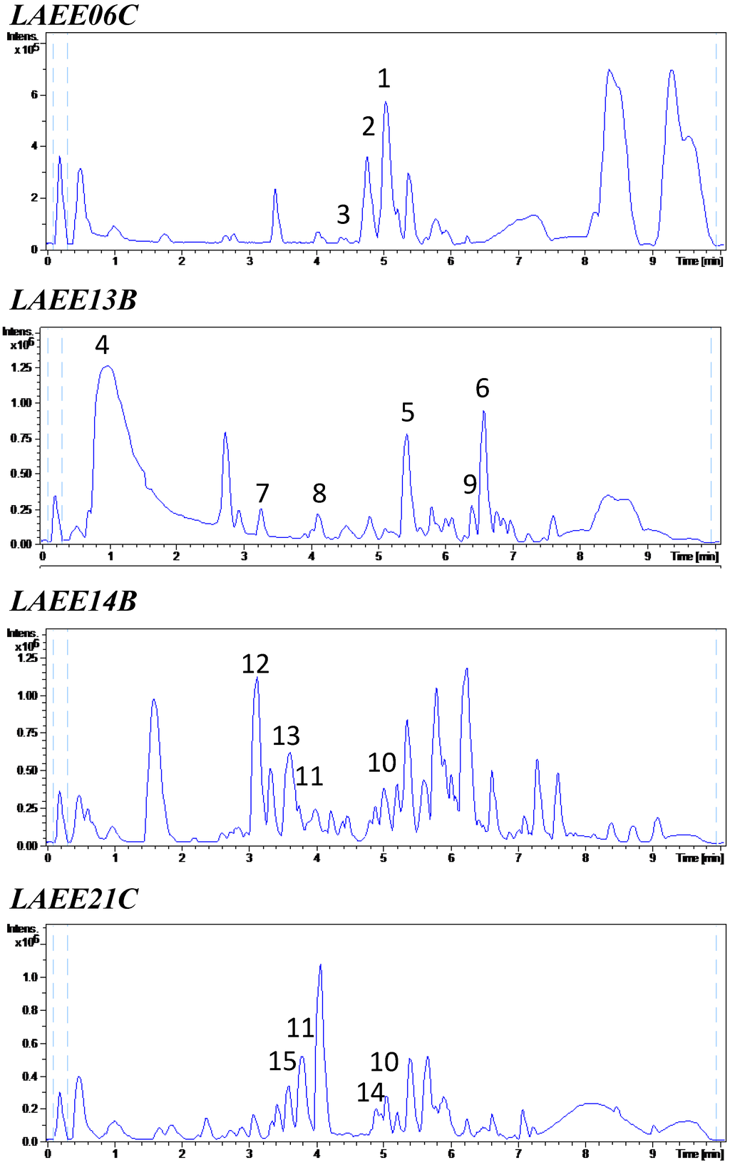This study highlights the potential of fungal secondary metabolites to interfere with bacterial QS. Although fungi are a renowned source of bioactive compounds, their ability to thwart bacterial cell-to-cell communication is poorly characterized. Among the diversity of aquatic environments screened in this study, marine endophytes clearly stood out. With the exception of LAEE13B, the QS-disrupting activity exhibited by the extracts of these endophytic filamentous fungi was unrelated to toxic effects on the reporter strain Chromobacterium violaceum CVO26. LC-HRMS profiles of these extracts revealed the presence of a broad diversity of fungal metabolites (Figure 5), some of them of recent identification in marine-derived strains [62,63,64,65,66,67,68,69,70,71]. Interestingly, all these fungal extracts contained compounds that might represent new natural products whose identity and biological activity will be determined in further experiments. The identity of the compounds tentatively identified by HRMS and UV analysis and whether the presence of the abovementioned metabolites can explain the QS-inhibitory activity observed in the extracts or it is due to the presence of minor components, or even to the synergistic effect of combinations of these molecules are issues that remain to be determined. To the best of our knowledge, this is also the first report of QS inhibition in endophytic fungi isolated from marine organisms.