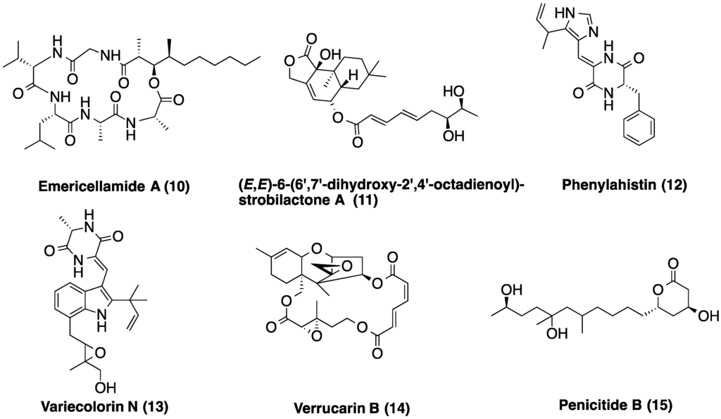 Fungi are a renowned source of products with an array of bioactivities, from antibacterial to antiviral, cytotoxic, antiinflammatory, antifeeding, antifungal or antioxidant, among many others [16,17,18]. In recent years, research on fungi associated with marine invertebrates and algae has revealed the presence of antifouling secondary metabolites [19,20]. Indeed, there is increasing evidence that many of the bioactive metabolites produced by sponges or algae as chemical defenses to avoid epibiosis are not truly produced by these organisms themselves, but by microbes—mainly bacteria and fungi—living in association with them [21,22]. Although bacterial-fungal interactions are largely documented [23,24,25], there are relatively few reports on QS inhibition by fungal metabolites. For instance, Rasmussen and co-workers identified patulin and penicillic acid from Penicillium species as QS inhibitors (QSIs) in P. aeruginosa [26]. Conversely, the fungal QS molecule farnesol from Candida albicans has been reported to inhibit the production of PQS in P. aeruginosa, which in turn prevents the yeast from entering in the filamentous phase through the production of the QS inducer 3-oxo-C12 homoserine lactone [27,28].