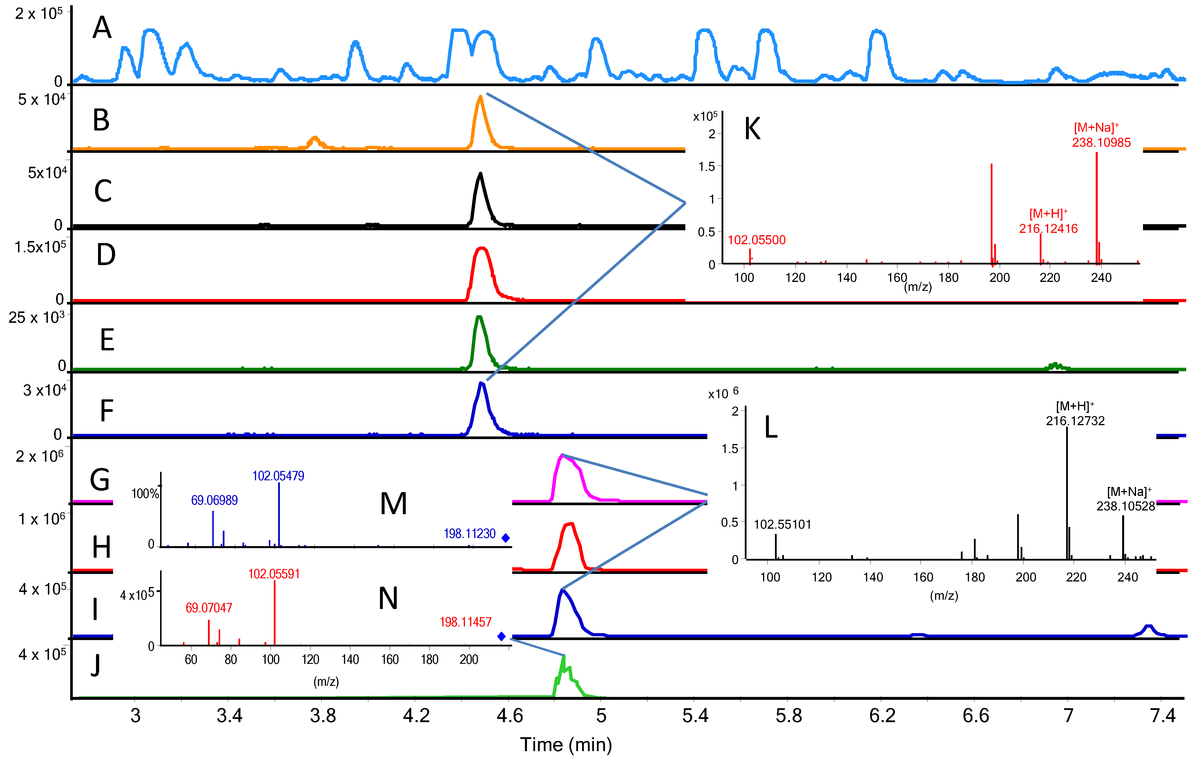 Detection of OH-C6 in S0203 using two different methods: A–F (standard tune) and G–J (small molecule tune). (A) BPC chromatogram; (B–F) extracted ion chromatograms of [M + H]+ ±0.5, [M + H]+ ±0.01, [M + Na]+ ±0.01, 102.05495 ±0.01, and 1 × 13C [M + Na]+ ±0.01; (G–I) extracted ion chromatograms of [M + H]+ ±0.5, [M + H]+ ±0.01, 102.05495 ±0.01, and [M + Na]+; (J) MS/HRMS trace of 216.123. M: MS/HRMS Library spectrum of OH-C6 [M + H]+ at 10 eV, N: simultaneously acquired MS/HRMS spectrum at 10 eV; (L) full scan spectrum (small molecule tune); (K) full scan spectrum (normal tune). Samples were analysed with a time difference of two months and thus retention was altered, but constant in the sequence and identical (±0.02 min) to reference standard.