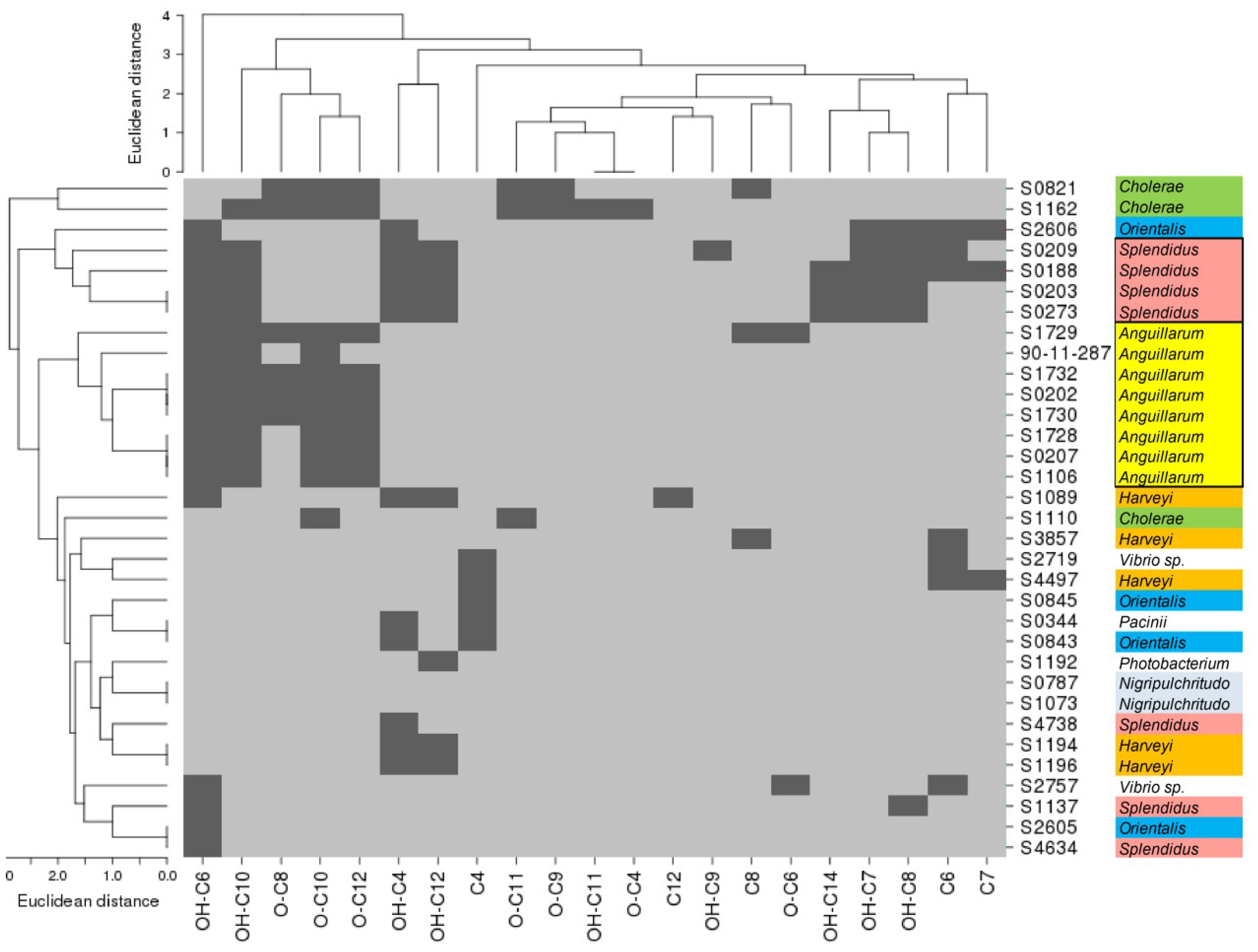 However, the Anguillarum clade strains were isolated from four different isolation sites from both temperate and tropical climates. The Splendidus clade strains were isolated from the same climate zone, but different locations. This demonstrates the differences between the isolates making them to unique strains besides taxonomic similarity. Combining the individual AHLs produced by the individual strains of a clade as identified by previous studies build similar profile to the herein described complete AHL profiles for the Anguillarum and Splendidus clade [26,33].