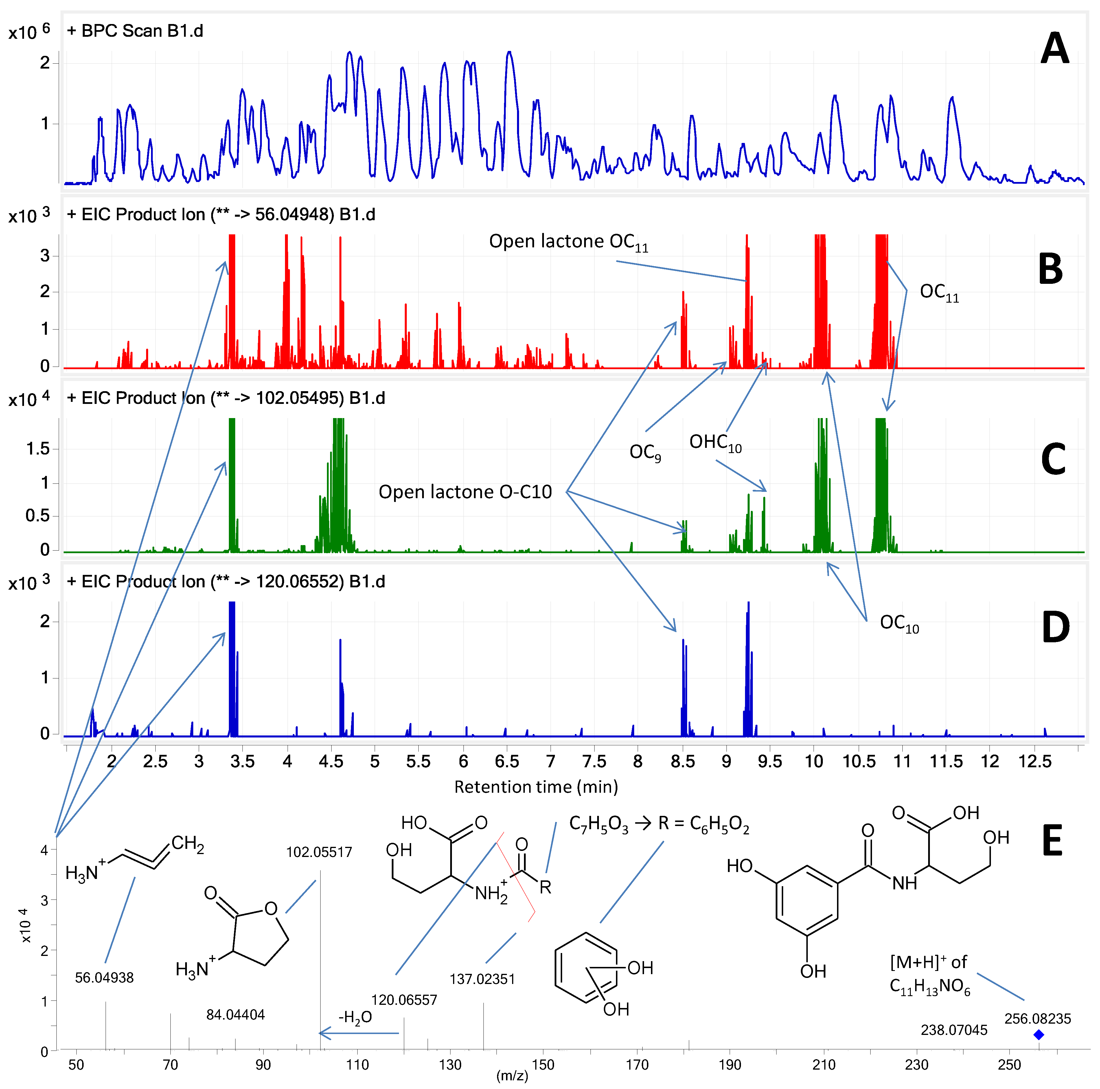 Chemical analysis of strain S1162. (A) base peak chromatogram; (B) m/z 56.04948 ± 0.02; (C) m/z 102.05495 ± 0.02; and (D) m/z 120.06552 ± 0.02, showing the extracted ion chromatograms of the three major diagnostic fragment ions with labels of six known long chain AHLs. At 3.36 min a novel open chain AHL is eluting with its MS/HRSM spectrum at 10 eV showed in E with a tentatively identified compound.