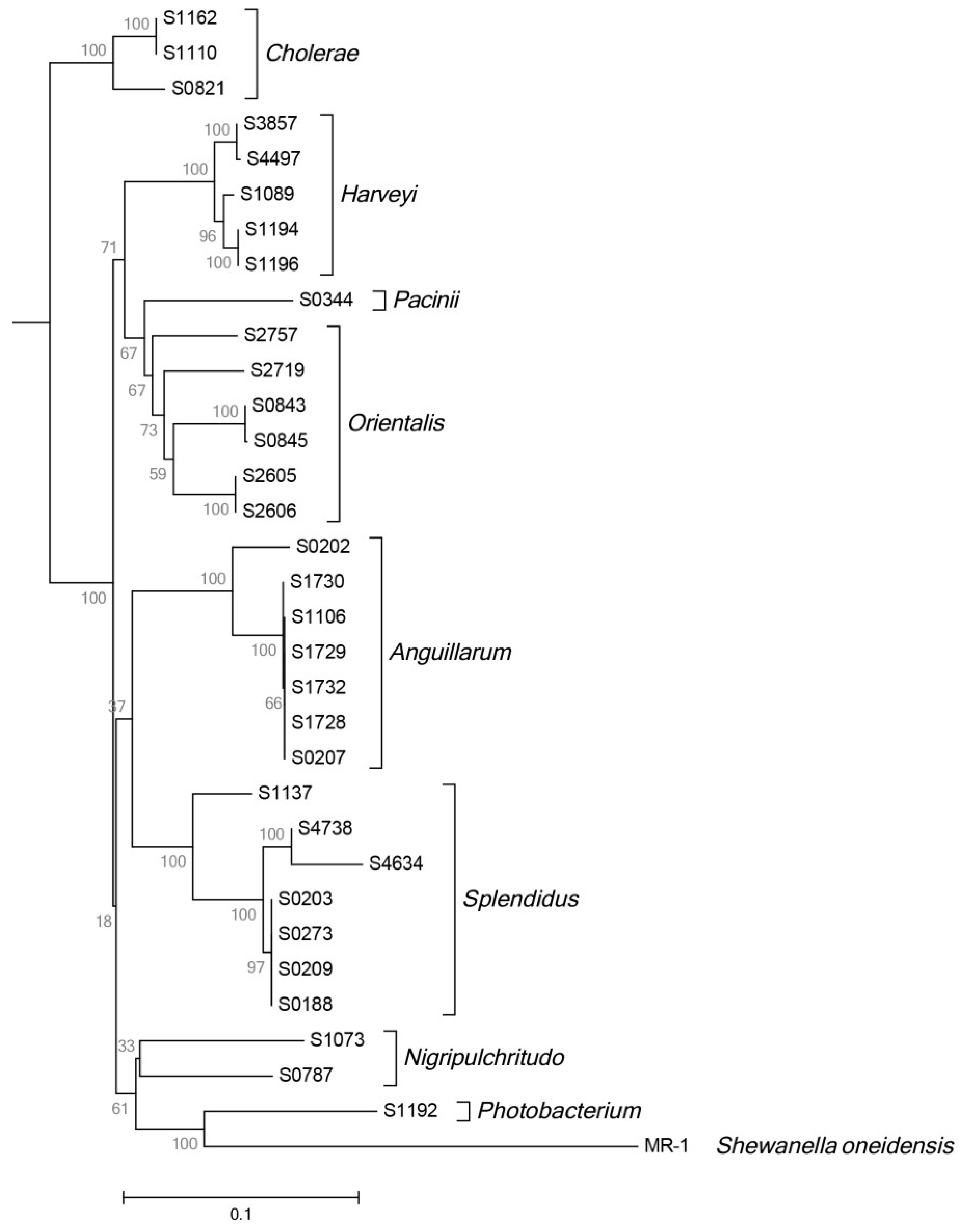 | S1106 | FJ457363 | V. anguillarum | V. anguillarum b | 0 | 4.570467 | −1.72975 |