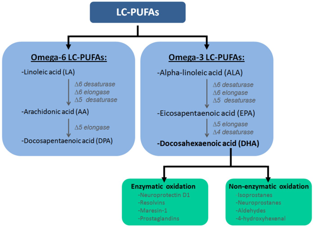 Classification of long chain polyunsaturated fatty acids (LC-PUFAs). PUFAs are subdivided into two subclasses: omega-6 and omega-3 PUFAs. Within the omega-6 PUFAs class precursor fatty acid, (i.e.,) linoleic acid (LA), is converted into arachidonicacid (AA) via ∆6-desaturase, ∆6-elongase and ∆5-desaturase. Subsequently, AA can be metabolized into docosapentaenoic acid (DPA) via ∆5-elongase. In the omega-3 fatty acid class, the precursor fatty acid, i.e., α-linoleic acid (ALA), is converted into eicosapentaenoic acid (EPA) via ∆6-desaturase, ∆6-elongase and ∆5-desaturase, which can subsequently be converted into docosahexaenoic acid (DHA) via ∆5-elongase and ∆4-desaturase. DHA is the precursor of several bioactive products, because it can be converted via enzymatic and non-enzymatic oxidation. DHA can be metabolized into e.g., resolvins E1 & E2 and D1–D5, maresin-1 and neuroprotectin D1 by means of enzymatic oxidation. These eicosanoids can enter the nucleus where they downregulate gene expression, promote inflammation or enter the bloodstream. This is where they reduce platelet aggregation and accumulation of fatty acids in the arteries. In non-enzymatic oxidation, DHA can be oxidized by radical oxygen species into lipid peroxides such as neuroprostanes, isoprostanes, aldehydes and 4-hydroxyhexenal. These peroxides can activate transcription factors such as peroxisome proliferator-activated receptors (PPARs) and nuclear factor-like 2 (Nrf2), which upregulate gene expression in the nucleus. (∆6/∆5/∆4: at the double bond at the 6th/5th/4th position).