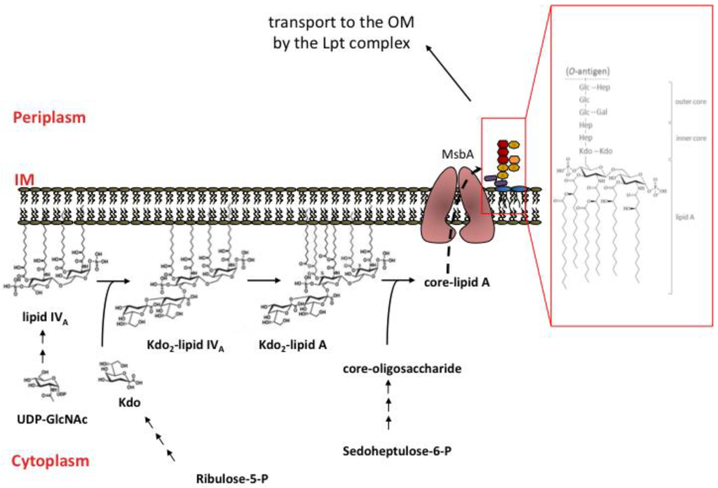 LPS biosynthesis in E. coli K12 strains. Cytoplasm and inner leaflet of IM: lipid IVA is synthesized from two molecules of the sugar nucleotide UDP-GlcNAc. Sequential addition of two Kdo molecules to lipid IVA produces the Kdo2-lipid IVA moiety which undergoes two late acylation reactions to give Kdo2-lipid A. Core oligosaccharide is assembled on Kdo2-lipid A via sequential glycosyl transfer from nucleotide sugar precursors. Outer leaflet of IM: core-lipid A is translocated across the IM by MsbA transporter. Schematic representation of core lipid A: violet rectangle, Kdo; yellow heptagon, heptose; red hexagon, glucose; orange hexagon, galactose. In the inset the chemical structure of E. coli K12 LPS is shown.
