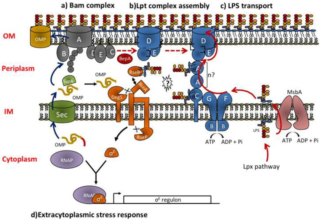 Overview of OMPs and LPS biogenesis pathways and extracytoplasmic stress response. (a) OMPs are synthesized in the cytoplasm and translocated across the IM by the Sec translocon. After translocation, the signal sequence (indicated in red) is cleaved. In the periplasm, chaperone proteins as SurA assist OMPs folding and deliver them to the BamABCDE complex for assembly at the OM. Blue arrows show the sequence of events occurring during OMPs biogenesis. (b) LptD is an OMP and follows the chaperone/Bam folding pathway. Correct LptD folding requires its association with the lipoprotein LptE and interdomain disulfide bridges isomerization. LptD-LptE interaction at the Bam complex is favored by the chaperone/protease BepA. Red dashed arrows show the sequence of events occurring during LptDE complex assembly. (c) LptDE complex is the LPS OM translocon. LPS is synthesized in the cytoplasm by the Lpx pathway, flipped to the periplasmic face of the IM by MsbA and transported through the periplasm to the outer leaflet of the OM by the Lpt machinery. Continuous red arrows show the sequence of events occurring during LPS biogenesis. (d) Mislocalized or misfolded OMPs and defects in the LPS export pathway trigger the σE envelope stress response (black arrows). Misassembled porins bind to DegS, cleaving RseA and initiating the σE stress response. The current model suggests that defects in Lpt assembly/function result in RseB binding to LPS possibly released by the Lpt machinery (question mark). RseB bound to LPS frees RseA that can then be cleaved by OMP-activated DegS and by RseP thus activating the σE stress response.