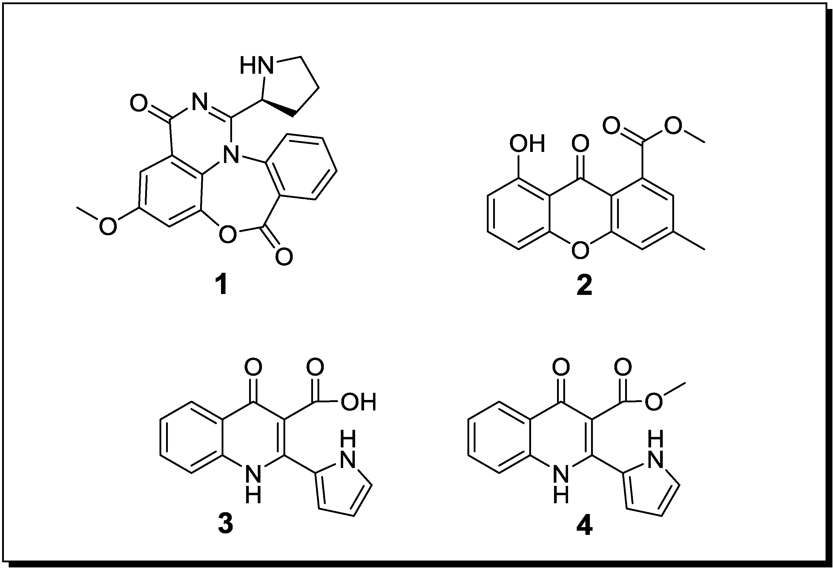 Co-cultivation of two unidentified mangrove-derived endophytic fungi, resulted in the production of the new alkaloids marinamide (3) and marinamide methylether (4) [50]. When studied for their cytotoxic effects on HepG2, 95-D, MGC832 and HeLa cells, IC50 values for marinamide (3) were in the nanomolar range whereas those of marinamide methylether (4) were in the low micromolar range [60].