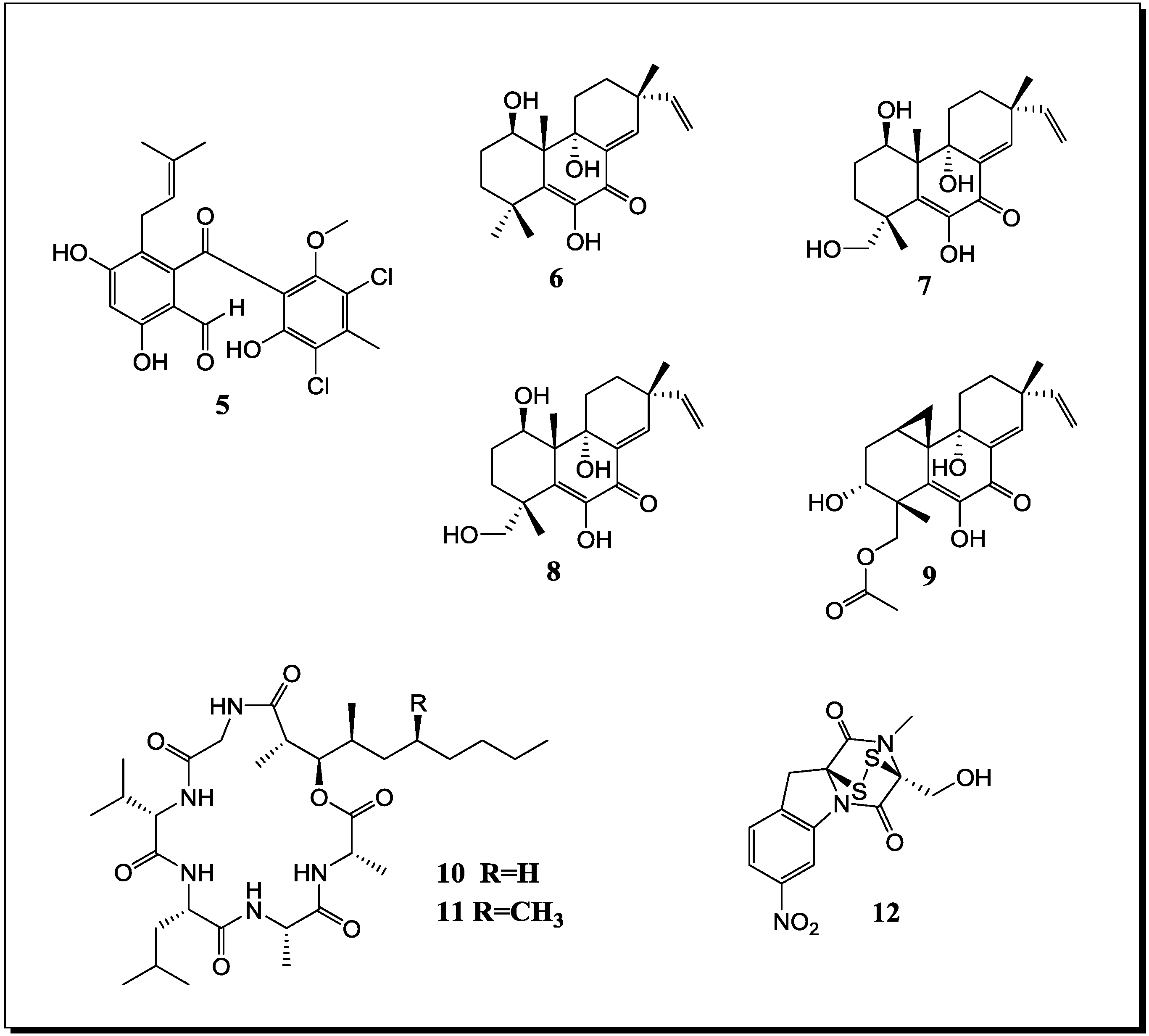Co-cultivation of a marine-derived Libertella sp. fungus and the marine-derived bacterium Thalassopia sp. (CNJ-328) yielded the novel diterpenoids libertellenones A–D (6–9) which are presumably of fungal origin since diterpenes are far more common fungal rather than bacterial secondary products. The cell free bacterial culture broth as well as autoclaved cultures of CNJ-328 or an EtOAc extract of the bacterium failed to induce the accumulation of 6–9 by the fungus Libertella sp. Therefore a direct physical contact of fungus and bacterium is assumed to be necessary for induction of the libertellenones [53]. In spite of being induced by a bacterium, the libertellenones failed to show antibiotic properties against CNJ-328, MRSA or against a vancomycin-resistent E. faecium strain whereas they exhibited cytotoxic activity against HCT-116 cells with IC50 values between 0.76 and 53 µM, dependent on the derivative investigated [53]. Interestingly, in the last two studies the bacterial strain CNJ-328 was found to induce different biosynthetic pathways in Libertella sp. and in Pestalotia sp., respectively. Whereas the core structure of pestalone (5) is a polyketide which features a prenyl substituent, the libertellenones (6–9) are terpenoids.