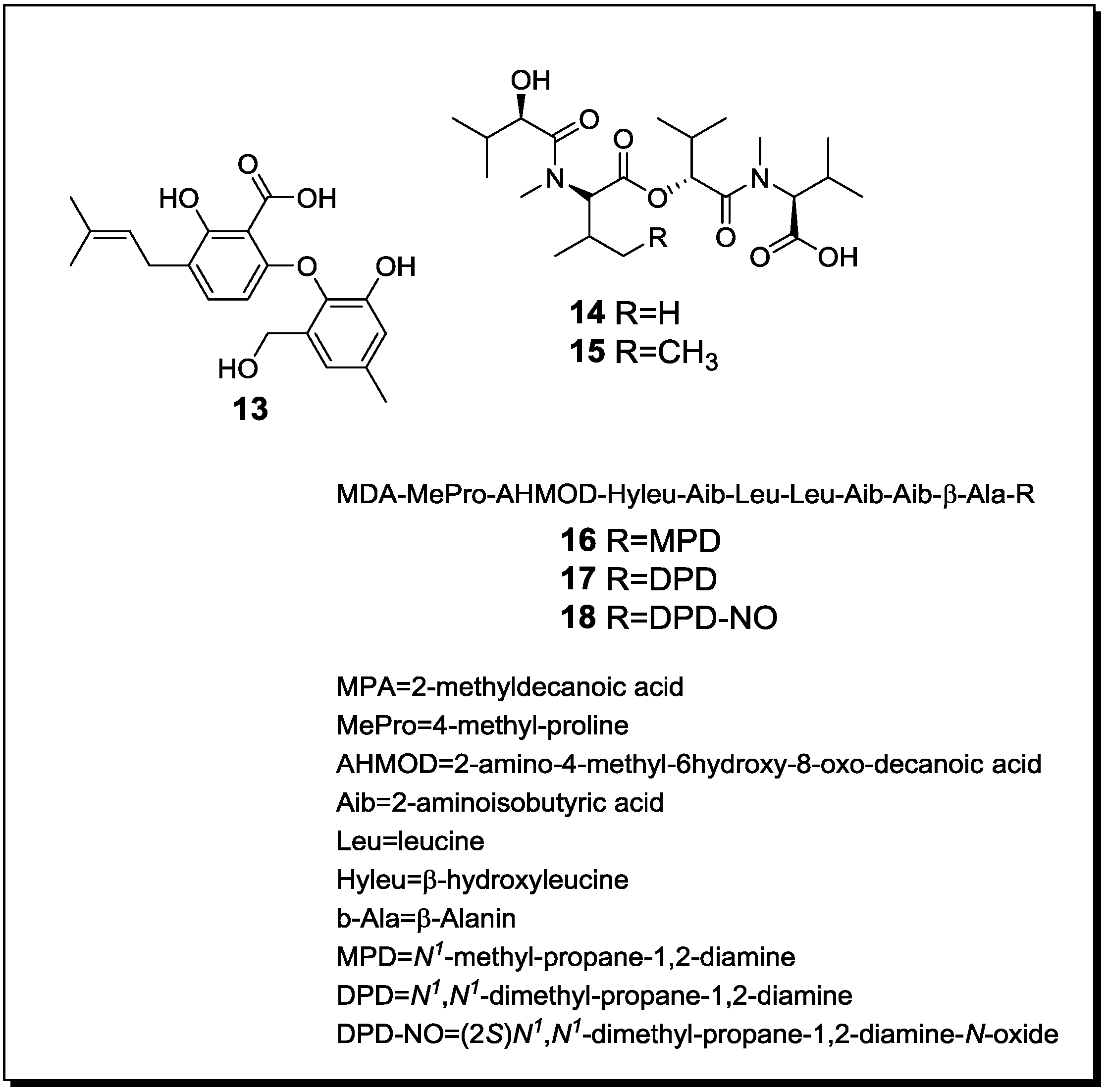 Co-cultivation of the plant endophytic fungi Fusarium tricinctum and Fusarium begoniae yielded the new linear depsipetides subenniatin A (14) and B (15), together with the known cyclic depsipeptides enniatins A, A1, B and B1 that had been previously reported from F. tricinctum [62]. In contrast to the cyclic enniatins, the new compounds failed to show activity against the murine lymphoma cell line L5178Y or against the bacterial pathogens E. coli, S. aureus and P. aeruginosa. It may be speculated that compounds 14 and 15 are detoxification products of the cyclic enniatins that result from hydrolytic activity of F. begoniae. Interestingly, co-cultures of F. tricinctum and Fusarium equiseti failed to elicit the production of the new compounds 14 and 15 [62].