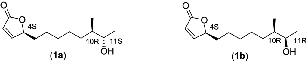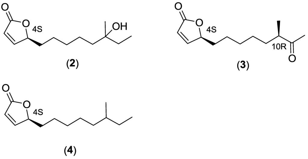 - Dai, W.-M.; Shi, L.; Li, Y. Total synthesis of (4s,10r)-4-hydroxy-10-methyl-11-oxododec-2-en-1,4-olide and related bioactive marine butenolides. Tetrahedron Asymmetry 2008, 19, 1549–1556. [Google Scholar] [CrossRef]
