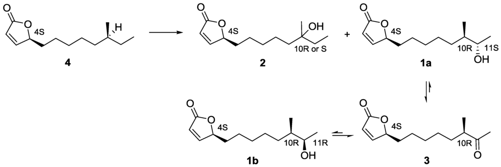 From the time of appearance and structure of the butenolides 1–4, we propose that the butenolide 4 with a non-functionalized side chain is the starting precursor for the biosynthesis of butenolides 1–3. We believe that the side chain in butenolide 4 is oxidized stereo-specifically to one of the two possible diastereomers of the tertiary alcohols 2 (4S10R) or 2 (4S10S) and the secondary alcohol 1a in favor of the latter. If this hypothesis is correct, the absolute stereochemistry for the butenolide 4 with a non-functionalized side chain should be 4S10S. We also propose that the butenolide secondary alcohol 1a is oxidized to the butenolide ketone 3, and during this process epimerization of the hydroxyl at C-11 by unspecific reduction or via reverse oxidation of the ketone results in a 1:1 ratio of the secondary alcohols 1a and 1b (Figure 4). The enzyme(s) responsible for the oxidation in the biosynthetic pathway are currently under investigation.