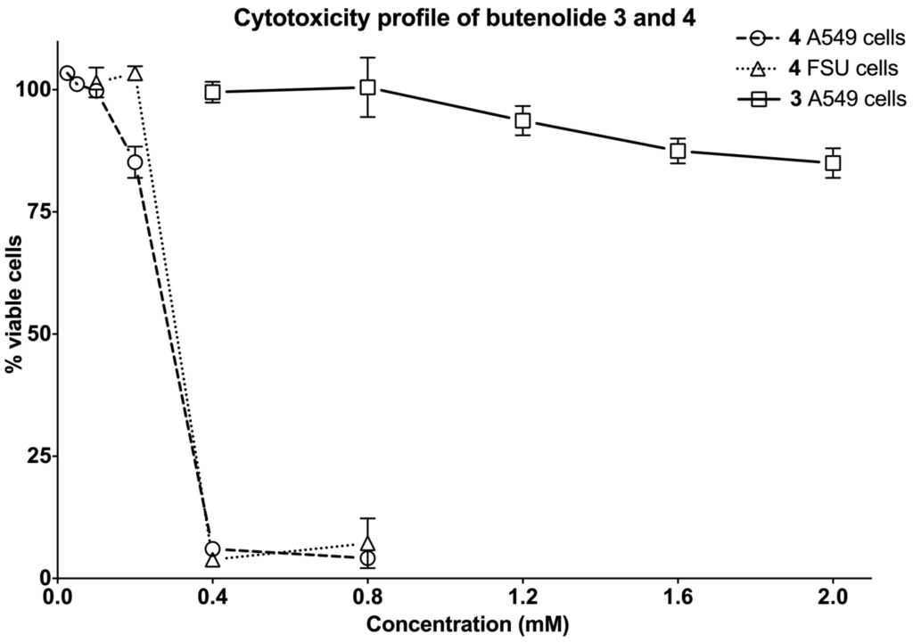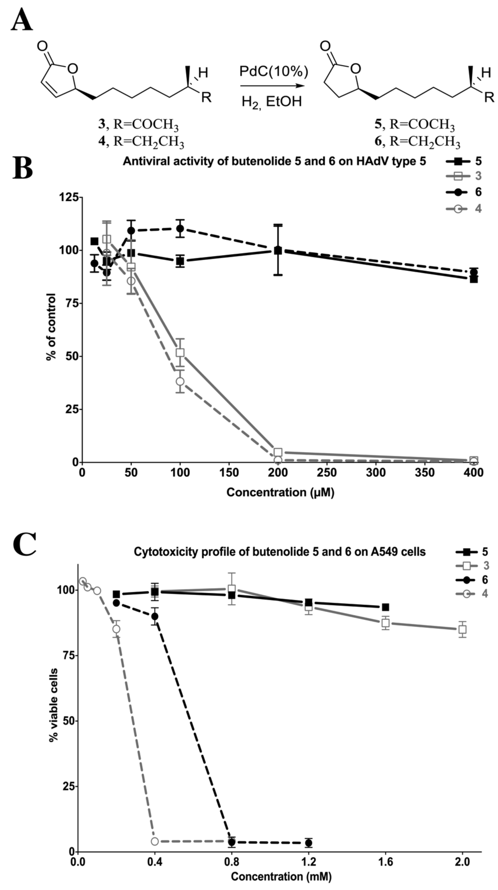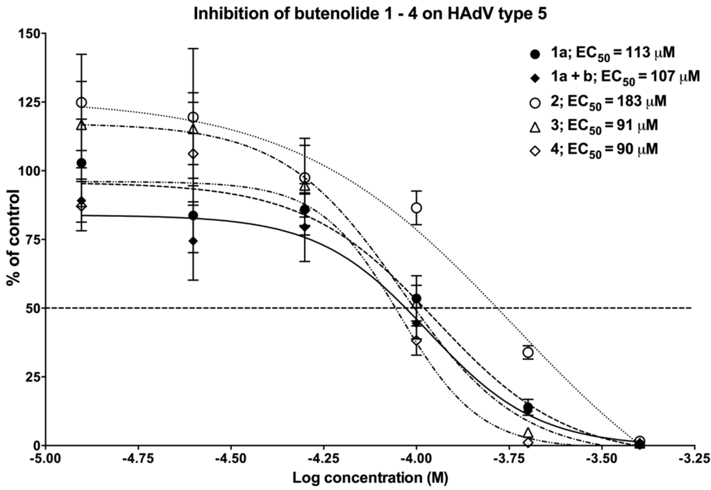 The HAdV type 5 stock was diluted in DMEM (Sigma-Aldrich, St. Louis, MO, USA) with 2% FBS (Gibco®, Life Technologies, Grand Island, NY, USA) to the appropriate concentration to be added per well. Then 200 μM of the ketone butenolide 3 was added and the mixture was incubated at 37 °C for 2 h with shaking. Subsequently, the growth medium was removed from the cells and 500 μL of this mixture was added per well with confluent A549 cells in 24 well plates. In parallel, an identical mixture with no incubation time was added to wells as a control and the antiviral activity was analyzed 24 h post infection with qPCR assay.