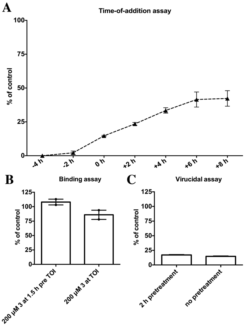 35S labelling of HAdV 5 was performed as previously described [33] as well as the binding experiment [10]. In brief, A549 cells were detached with 0.05% EDTA in PBS and resuspended in growth media and were reactivated for 15 min at 37 °C. Next, 200 μM of compound 3 was added, and the cell suspension was incubated for 1.5 h at 37 °C. The cells were then dispensed in a 96-well plate and centrifuged at 1500 rpm, 5 min, at 4 °C. The pellets were resuspended in DMEM with 1% BSA and 200 μM 3. 35S labelled HAdV 5 (1 pg per cell) was added and the plate was incubated for 1 h at 4 °C. Following, the cells were washed twice with ice-cold DMEM with 1% BSA and were transfered to scintillation tubes with 2 mL scintillation fluid (Optiphase HiSafe 3, Perkin-Elmer, Walltham, MA, USA). The cell-associated radioactivity was measured using a liquid scintillation counter (Wallac 1409, Perkin-Elmer, Waltham, MA, USA).