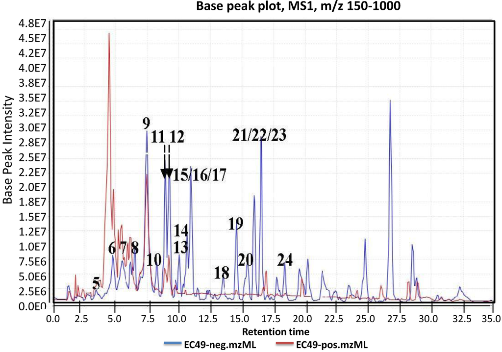 Total ion chromatogram of crude ethyl acetate extract of Actinokineospora sp. EG49 ISP2 agar culture in both positive (blue line) and negative (red line) modes. The chromatogram was an output generated from MZmine; a high-throughput differential expression analysis software, which provides algorithms for peak alignment, normalization, and deconvolution. The resulting data sets were then subjected to automated dereplication.