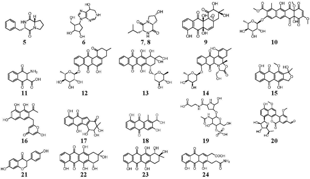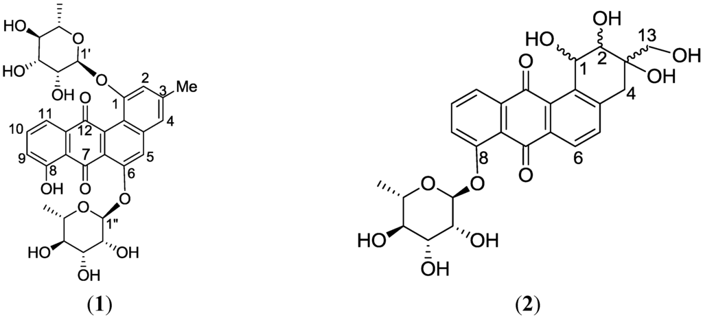 - Huang, H.; Yang, T.; Ren, X.; Liu, J.; Song, Y.; Sun, A.; Ma, J.; Wang, B.; Zhang, Y.; Huang, C.; et al. Cytotoxic angucycline class glycosides from the deep sea actinomycete Streptomyces lusitanus SCSIO LR32. J. Nat. Prod. 2012, 75, 202–208. [Google Scholar] [CrossRef]