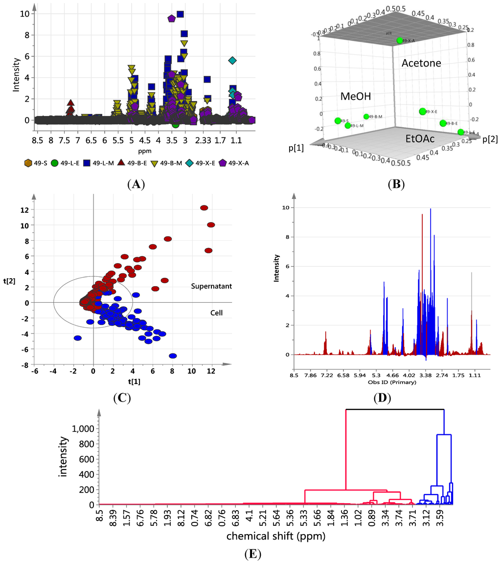 XA); (B) 3D Principal component analysis (PCA)-score plot; (C) PCA-loading plot of cellular (blue) vs. supernatant extracts (red); (D) Line plots obtained from the hierarchical clustering analysis of the PCA results as shown in (E). The primary observed ID (obs ID) is synonymous to the chemical shift in ppm.