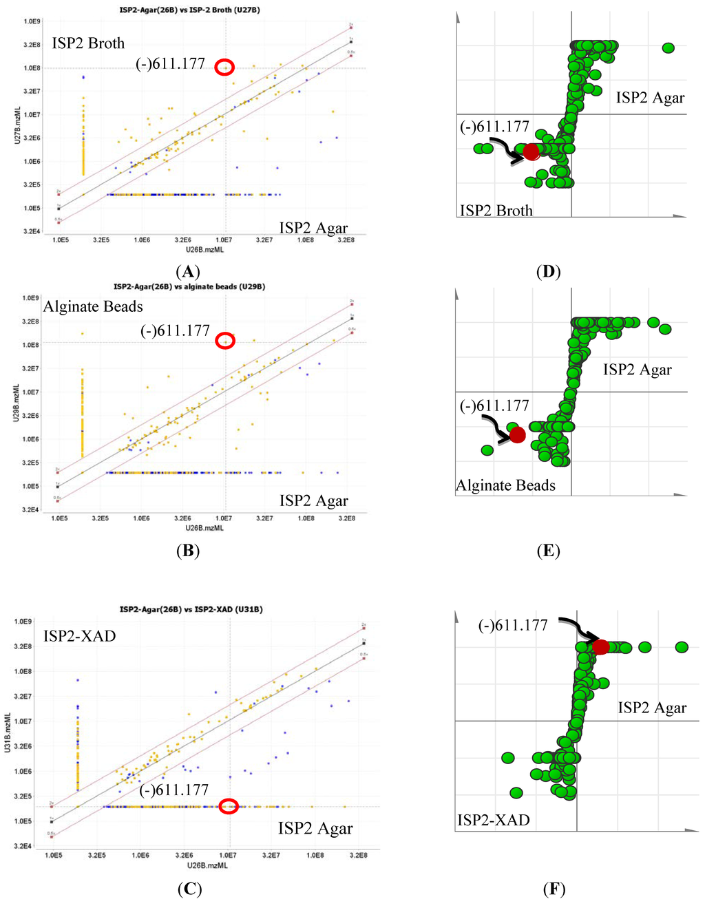 To optimize production of the biologically active metabolites, dereplication was performed for microbial extracts prepared in triplicates obtained from four different growth media strategies (ISP2 agar, ISP2 broth, ISP2 broth with XAD, and alginate beads), as shown in Figure 7 and Figure 8. Through the scatter- and S-plots (Figure 7), it was shown that unique metabolites were produced in respective culture media. The active antitrypanosomal compound actinosporin A (m/z 611.1768 [M − H]−) with retention time at 8.98 min was shown to be produced at the highest yield in liquid broth (LE) and alginate beads (BE) media (Figure 8), while it was produced in negligible amounts when XAD (XE) was used. There was a significant decrease of probable quinone congeners in the XAD media, which was indicated by the disappearance of dispersed components (represented by yellow dots) in the upper region of the diagonal for the ISP2 XAD extract when comparing the MZmine scatter plots in Figure 7A,B with Figure 7C.