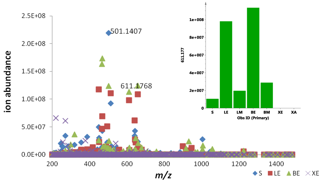 Scatter plots of the dereplicated mass spectral data of EG49 crude extracts obtained from four different growth media: S = ISP2 agar, LE = ISP2 broth, BE = calcium alginate beads, and XE = ISP2 broth with XAD. Inset shows the contribution of actinosporin A in different culture media and extracts.
