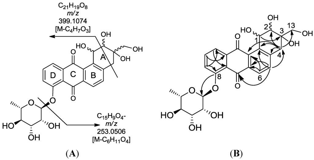 High resolution FT tandem MS was performed obtaining a fragment ion at m/z 399.1079 [M − C4H6O3]− which implied a cross-ring cleavage comparable to a glycan unit [] and confirmed the presence of a highly hydroxylated saturated ring A. High resolution mass spectral data of the fragment ions verified the presence of four hydroxyl substituents on ring A as shown in Figure 9. Further fragmentation of the ion at m/z 399.1079 afforded an ion peak at m/z 253.0502 indicating the loss of a saccharide unit as in actinosporin A. The structure was determined as 1,2,3-trihydroxy-3-(hydroxymethyl)-8-rhamnosyl-benz[α]anthracene-7,12-dione and assigned the trivial name actinosporin B.