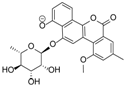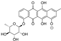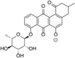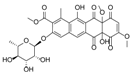 +18.0 (c 0.05, MeOH); UV (MeOH): λmax (log ε) = 254 (4.41), 379 (4.06), 408 (3.61) nm; 1H NMR (CD3OD, 600 MHz) δH 7.96 (1H, d, J11,10 7.4, H-11), 7.87 (1H, dd, J10,11 7.4, J10,9 8.2, H-10), 7.79 (1H, d, J5,6 7.8, H-5), 7.70 (1H, d, J9,10 8.2, H-9), 7.62 (1H, d, J6,5 7.8, H-6), 5.64 (1H, br s, H-1′), 4.93 (1H, bs, H-1), 4.83 (1H, d, J3A,3B 11.6, H-13A), 4.01 (2H, m, H-2 and H-2′), 3.51 (1H, m, H-5′) 3.33–3.53 (underneath HOD peak, H-13B, H-3′, H-4′), 3.01 (1H, d, J4A,4B 13.2, H-4A), 2.90 (d, J4B,4A 13.2, H-4B), 1.10 (3H, d, J6′,5′ 6.3, H-6′); 13C NMR (151 MHz, DMSO) δ = 181.0 (C-7), 156.9 (C-8), 140.7 (C-4a), 135.6 (C-11a), 133.27 (C-6a), 133.31 (C-12a), 123.9 (C-7a), 122.0 (C-11), 116.0 (C-12b), 72.5 (C-13), 71.7 (C-3), 71.5 (C-4′), 71.4 (C-3′), 70.5 (C-2′), 70.4 (C-2), 64.0 (C-5′), and 42.7 (C-4); HR-ESIMS: [M − H]− found at m/z 501.1402, calcd for C25H25O11 (501.1402); [M + H]+ found at m/z 503.1554, calcd for C25H27O11 (503.1548).