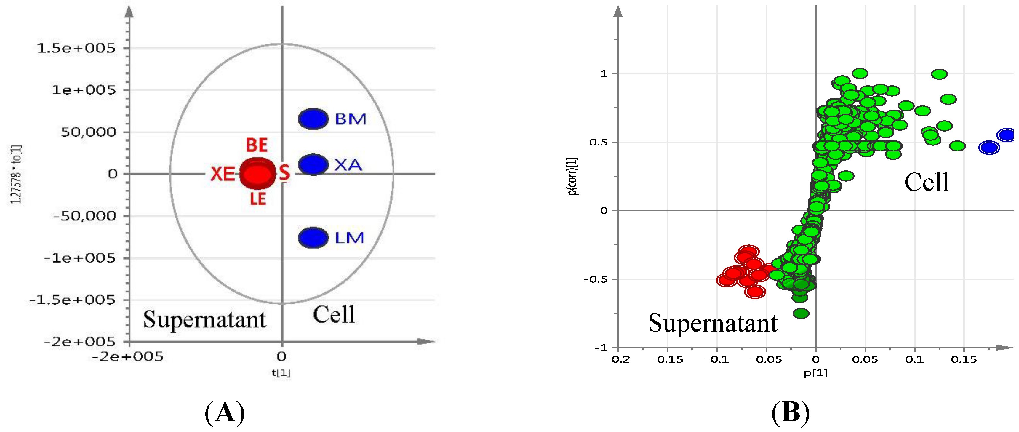 2.2. Metabolomic Profiling of Cellular and Supernatant Extracts from Liquid Broth Cultures of EG49