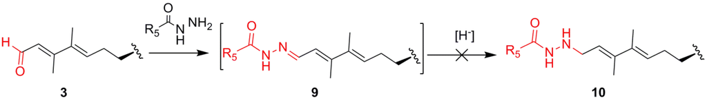 However, during reactions to prepare fluorescently labeled LFPs for development of a fluorescence based receptor binding assay [], attachment of fluorescent hydrazides was found to be achievable in a rapid and high yielding manner (Scheme 2). Somewhat unexpectedly, the Schiff base intermediate (9) produced by the reaction of the aldehyde with the hydrazide was highly stable and was not susceptible to reduction with various borohydride reducing reagents such as sodium borohydride, cyanoborohydride, etc. to give the hydrazide derivatives (10). This stability likely arises from conjugation with the butadiene moiety. Indeed, cell uptake studies of fluorescent hydrazone brevenal conjugates indicate that the complexes stay intact intracellularly for at least 48 hours. Due to brevenal’s limited reactivity, a series of substituted hydrazide “Schiff base” derivatives (9) were prepared and studied for their ability to displace brevenal and brevetoxin from their respective receptors (Table 1, Table 2 and Table 3).