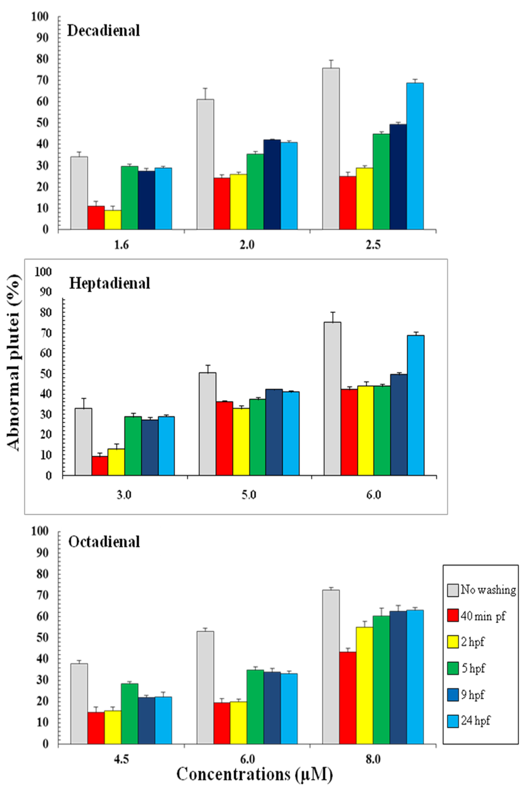 Percentage of abnormal Paracentrotus lividus plutei (%) produced after exposure to different concentrations of heptadienal, octadienal and decadienal and at different development times after fertilization. The percentages of abnormal plutei without washing are also reported.