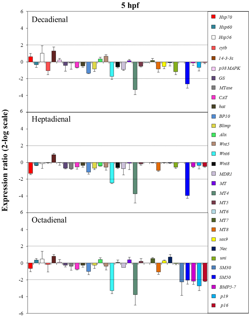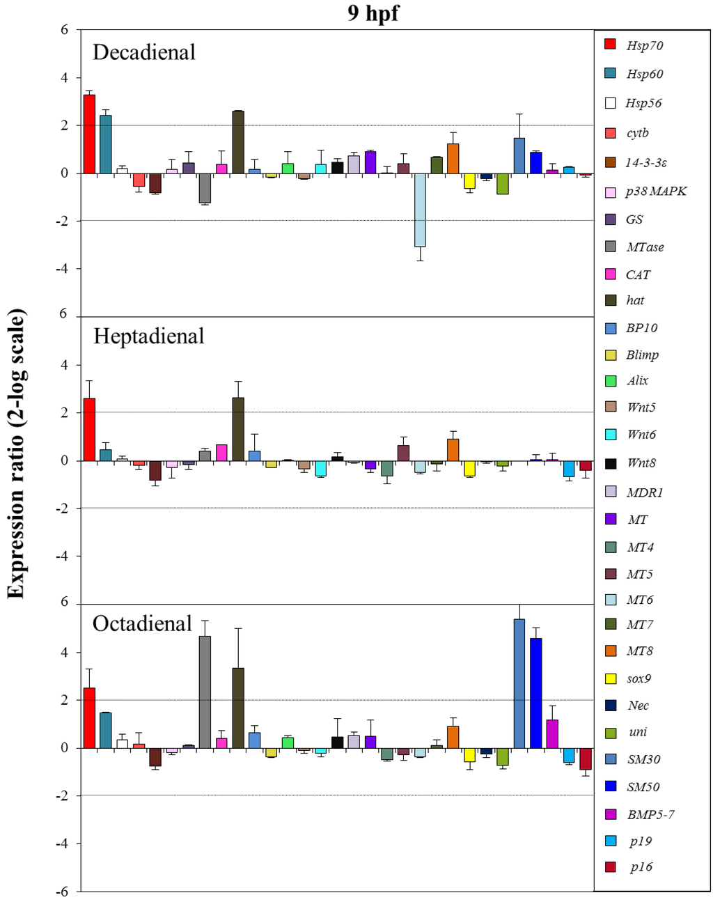 The histograms show the differences in the expression levels of thirty one genes followed by real-time qPCR. Paracentrotus lividus embryos were grown in the presence of decadienal, heptadienal and octadienal at teratogenic concentrations (1.6, 3.0 and 4.5 μM, respectively) and collected at 9 hpf. For more details, see also the legend to Figure 5.