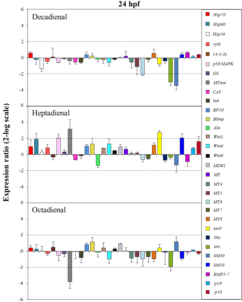 The histograms show the differences in the expression levels of thirty one genes followed by real-time qPCR. Paracentrotus lividus embryos were grown in the presence of decadienal, heptadienal and octadienal at teratogenic concentrations (1.6, 3.0 and 4.5 μM, respectively) and collected at 24 hpf. For more details, see also the legend to Figure 5.
