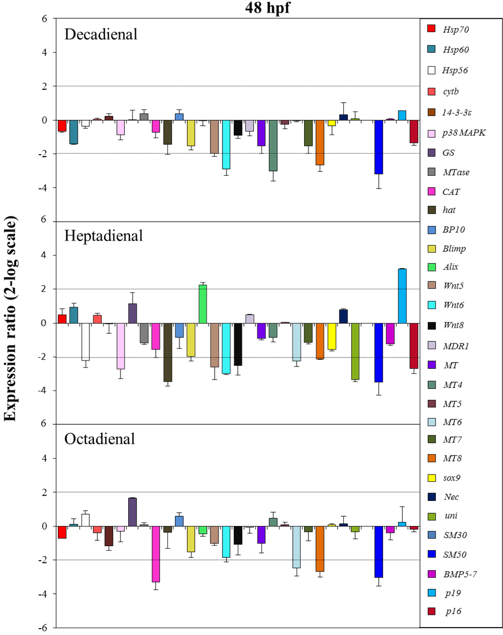 The histograms show the differences in the expression levels of thirty one genes followed by real-time qPCR. Paracentrotus lividus embryos were grown in the presence of decadienal, heptadienal and octadienal at teratogenic concentrations (1.6, 3.0 and 4.5 μM, respectively) and collected at 48 hpf. For more details, see also the legend to Figure 5.