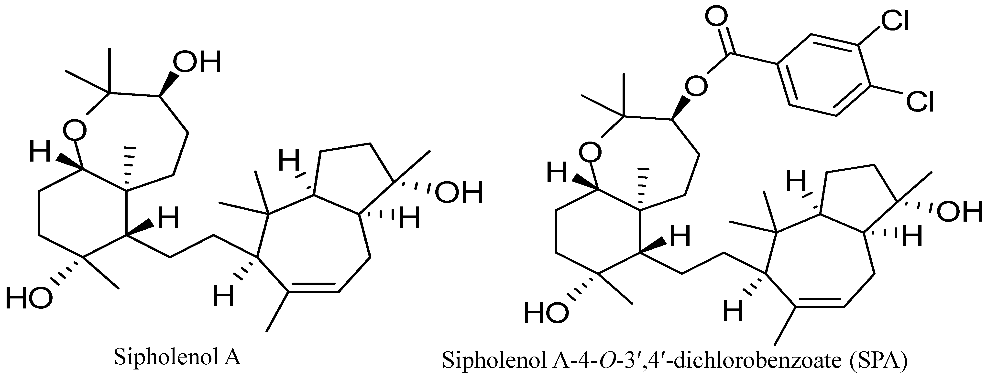 Chemical structures of sipholenol A and sipholenol A-4-O-3′,4′-dichlorobenzoate (SPA).