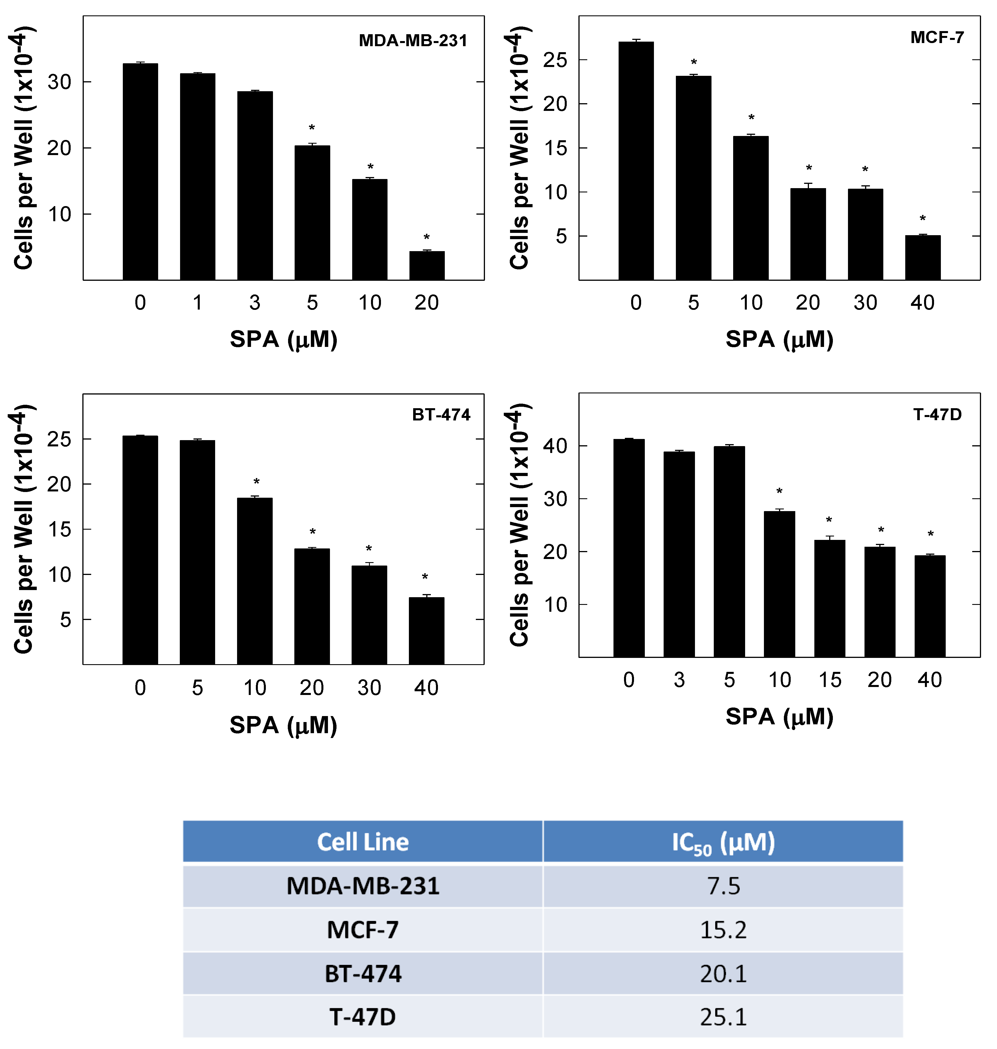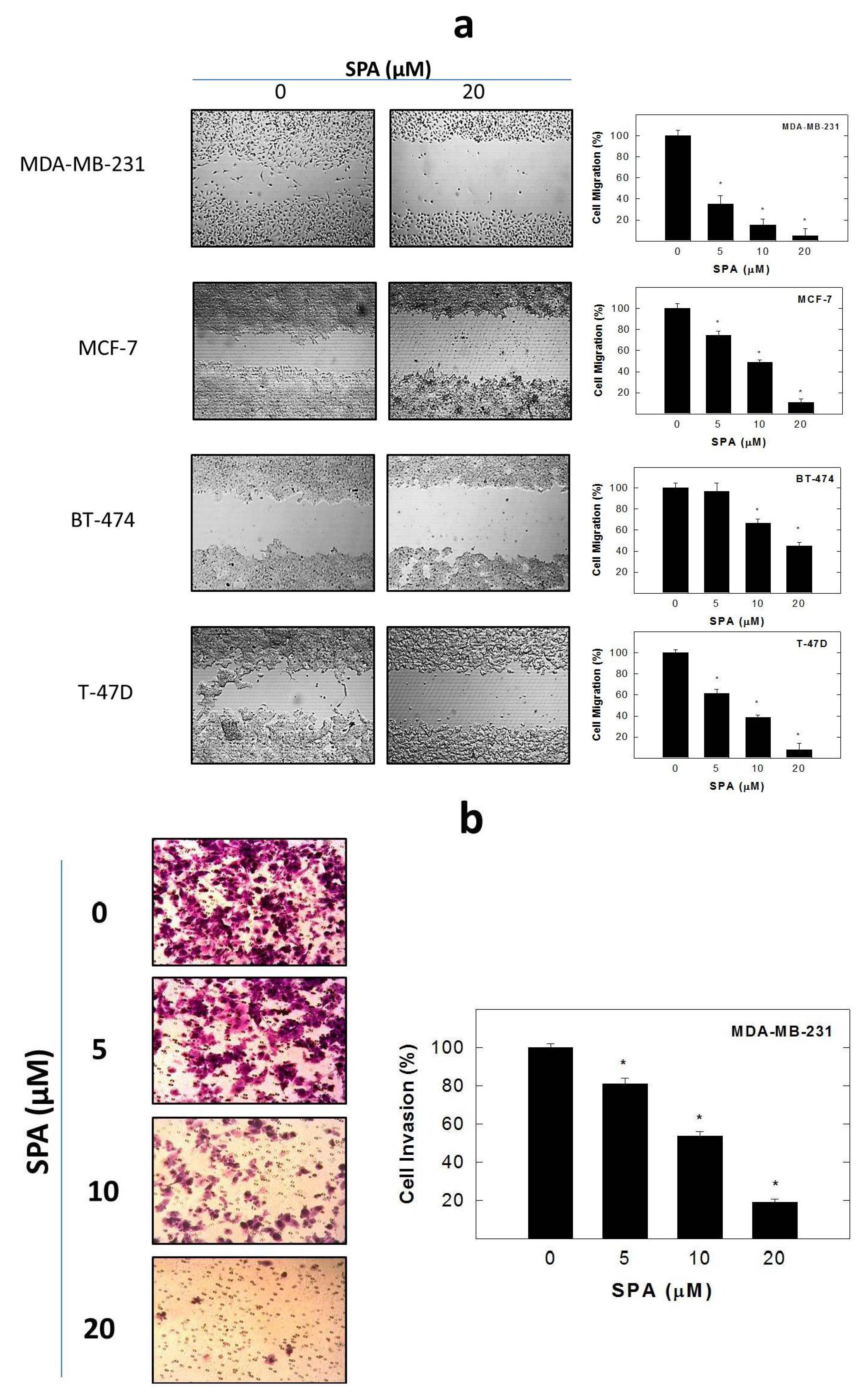 SPA treatment caused a dose-dependent inhibition of the cell proliferation and migration of MDA-MB-231, MCF-7, BT-474 and T-47D breast cancer cells, as shown by MTT and wound-healing assays. To study cell invasion, the MDA-MB-231 cell line was used for its aggressive and highly invasive nature [