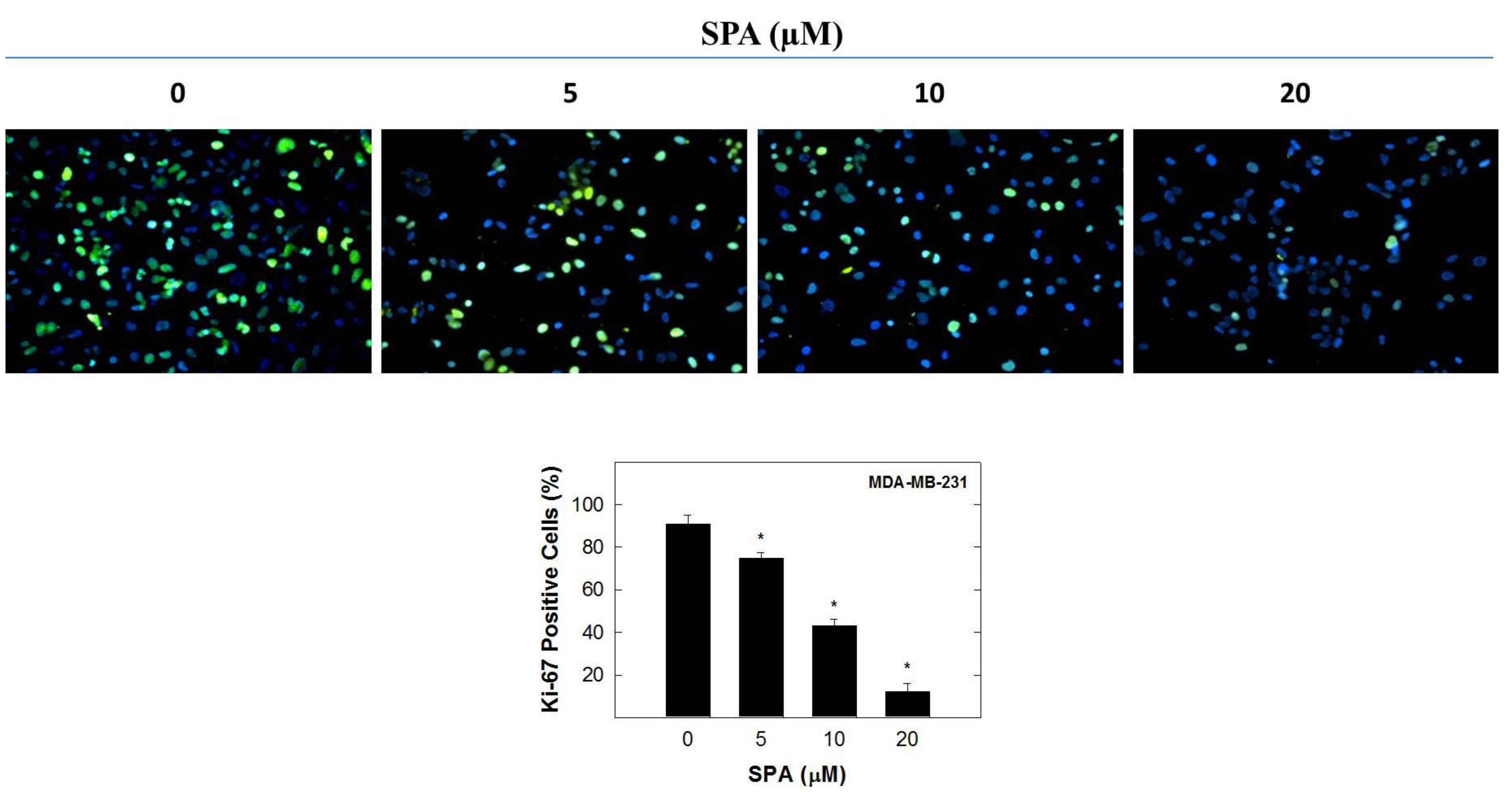 In this study, the inhibitory effect of SPA appears to be mediated through the suppression of Brk and FAK phosphorylation and subsequent inhibition of the phosphorylation of the downstream signaling molecules, such as AKT, MAPK and paxillin. SPA inhibited EGF-dependent mitogenesis, as indicated by a relative large reduction in positive Ki-67 staining in MDA-MB-231 breast cancer cells. Ki-67 is a nuclear antigen localized at the periphery of the chromosome scaffold and nuclear cortex [