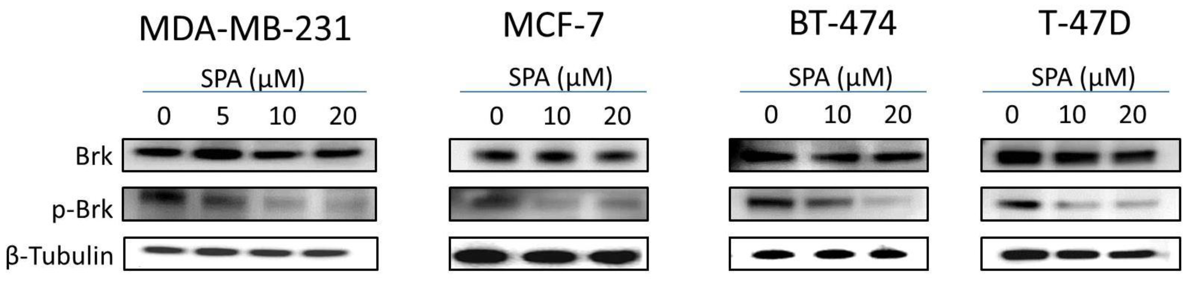 in vitro activity of SPA was well-correlated with its cell-free Brk phosphorylation inhibitory activity coupled with the absence of any cytotoxicity to the non-tumorigenic MCF10A cells [