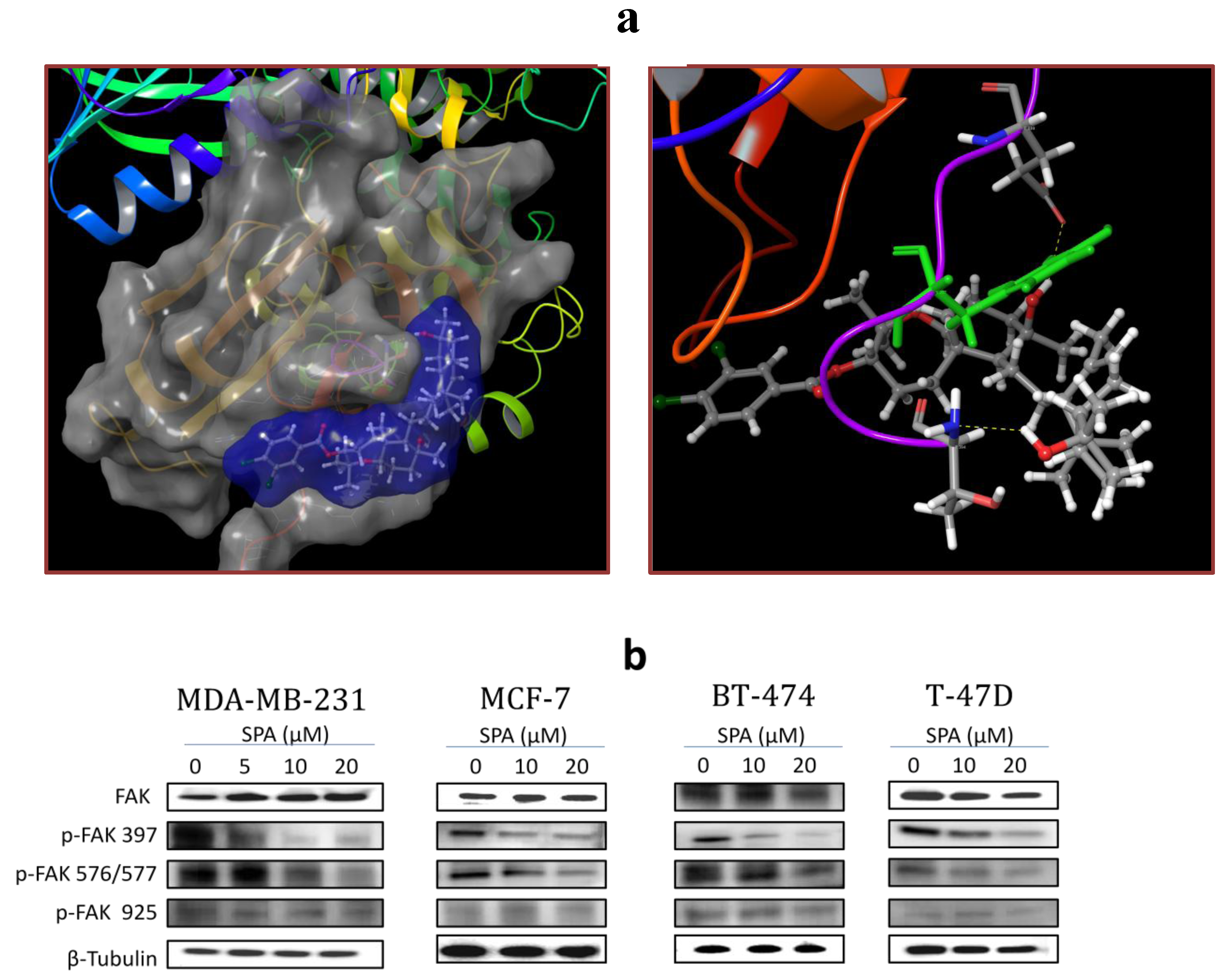 26]. In addition, SPA treatment inhibited Brk phosphorylation in a dose-dependent manner in the four tested breast cancer cell lines with no effect on the total Brk levels. Molecular modeling experiments showed that SPA was docked into the FAK kinase domain without showing any binding affinity. When SPA was docked at the structural pocket of the X-ray crystal structure of the FERM domain of FAK (containing the Y397 site), it showed a perfectly fitting docking pattern. Western blot experiments showed that SPA mainly inhibits the phosphorylation of FAK at the Y397 site, which validates the molecular modeling results. This offered SPA significant advantages because selective blocking of the phosphorylation at the Y397 FAK site consequently will block the activation of several FAK’s downstream signaling. SPA showed little or no effect on the FAK’s ATP-binding site, which shares structural features with several diverse tyrosine kinases, unlike most of other current known small molecule FAK inhibitors. This favors SPA’s uniqueness and selectivity over available FAK inhibitors by avoiding the expected off-target side effects. Furthermore, SPA had little or no activity on other FAK phosphorylation sites.