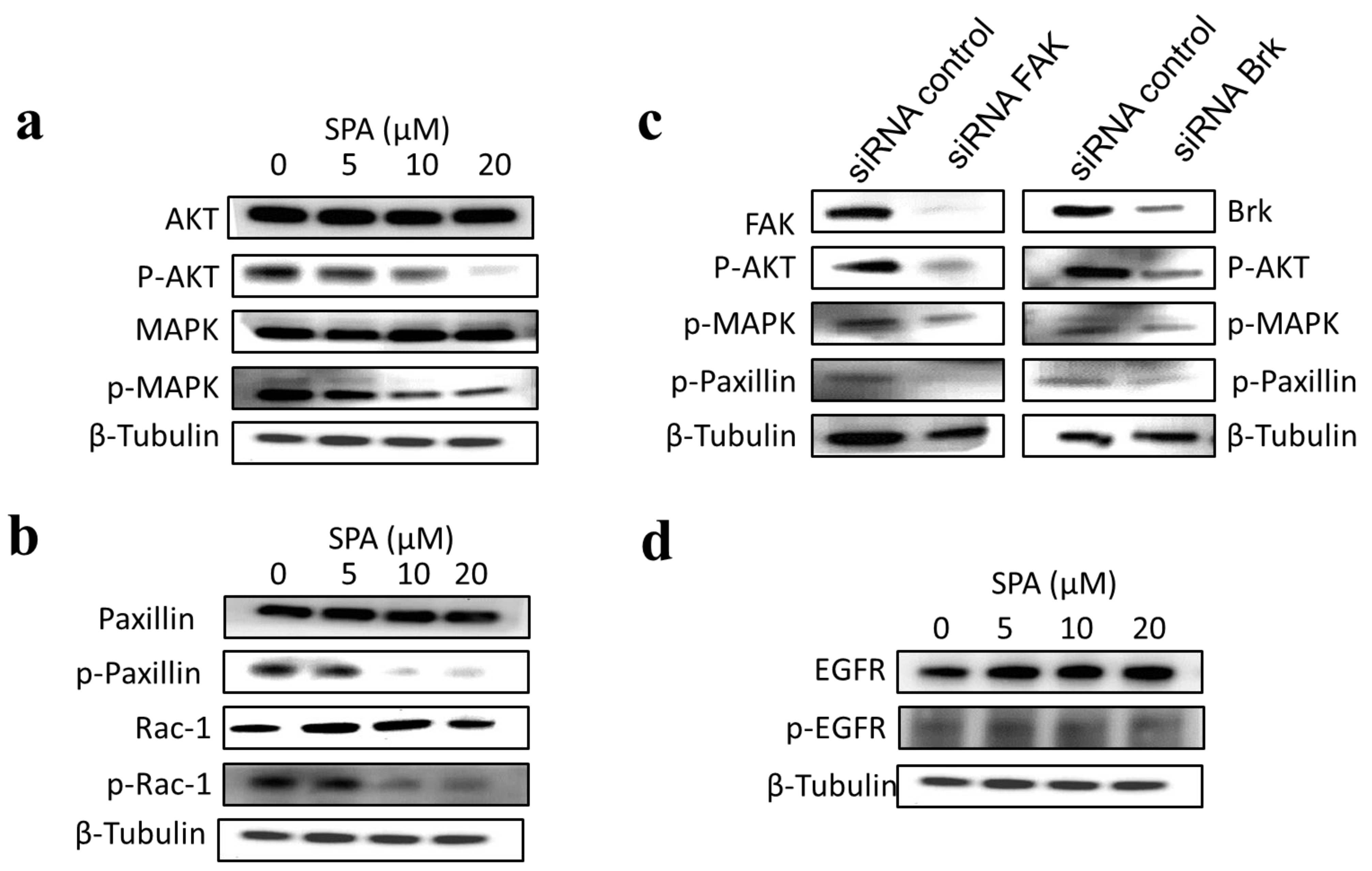 The inhibition of Brk and FAK activation caused the inhibition of the activation of downstream signaling molecules, such as AKT, MAPK, paxillin and Rac1. These results were confirmed by siRNA experiments, which showed that the depletion of Brk or FAK in the cells caused a decrease in the levels of p-AKT, p-MAPK, p-paxillin and p-Rac1. Previous studies showed that non-malignant MCF-10A mammary epithelial cells were resistant to SPA antiproliferative effects [