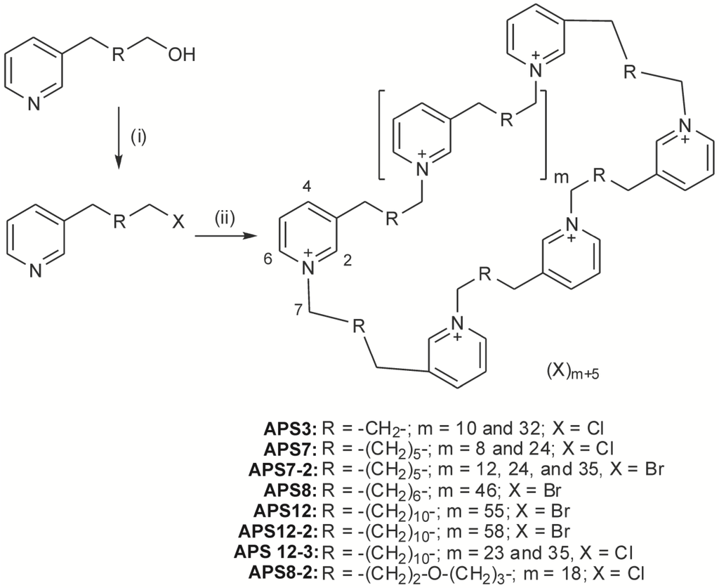 Their interesting biological effects, their potential use in the pharmaceutical and chemical industries, coupled with the insufficient quantities of natural poly-APS, have contributed to the development of new methods for synthesizing poly-APS analogues. This could enable the commercial production of sAPS with modified characteristics. In 2004, Mancini and colleagues synthesized dimers and tetramers of 3-alkylpyridinium salts [27]. In 2010, Houssen and colleagues reported a new protocol enabling synthesis of larger polymers that possess greater biological activities [28]. To determine how the structure of sAPS influences the biological activities, several sAPS, with various lengths of the alkyl chain, numbers of pyridinium rings and with different counter ions (bromide or chloride), have been synthesized.